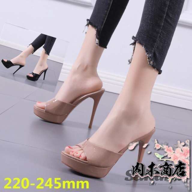 夏新作 ブラック ミュール ピンヒール サンダル サマー靴 ヒール12cm レディース スリッパ ハイヒール 夏シューズ エナメル靴 プラットフォームサンダル 婦人靴