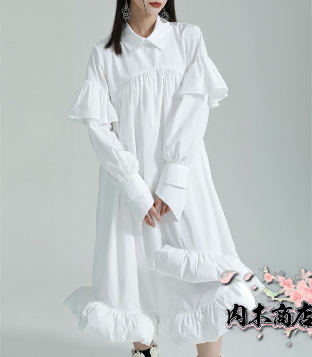 前後2wayフリルワンピース ワンピース レディース 長袖 フリルデザイン アシンメトリー ロングワンピ シャツワンピース 落ち感 モード系 個性的 ユニセックス 大人 カジュアル ゆったり きれいめ オフィス 楽ちん 秋冬とらみ 送料無料