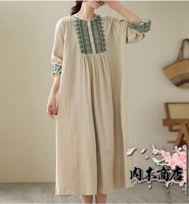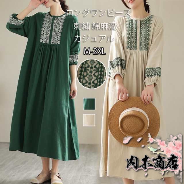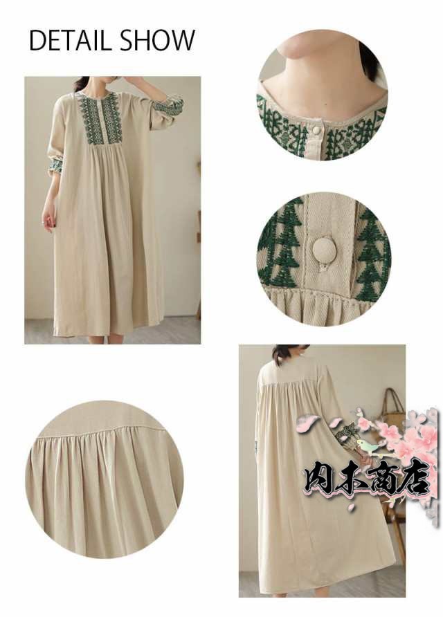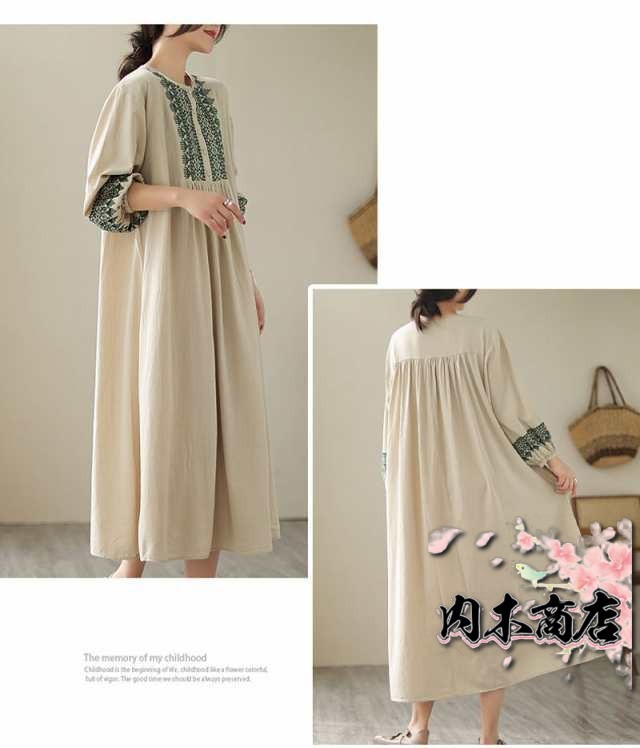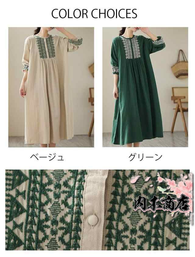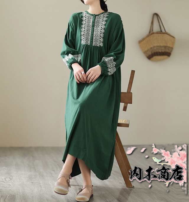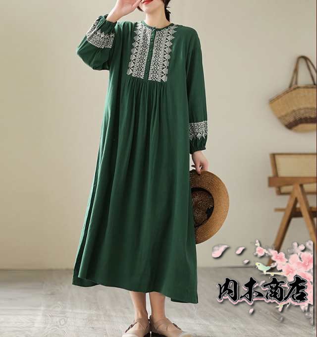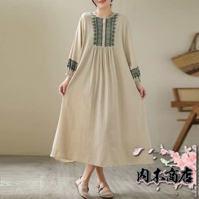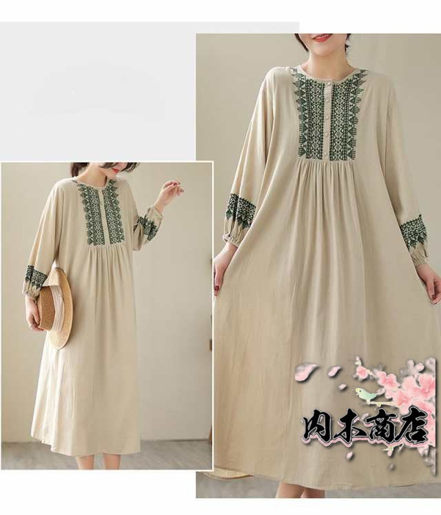 刺繍ワンピース リゾートワンピース ロング丈 刺繍 リネン フレア 春 夏 秋 長袖 大きいサイズ エスニック レトロ風 大人 シンプル 20代 30代 40代 50代