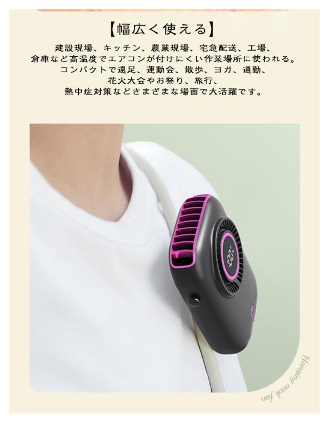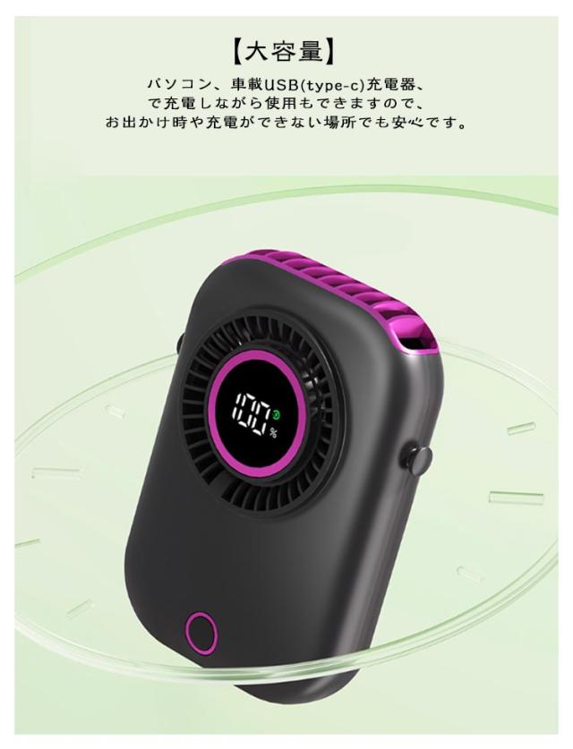 | 1台4役 多機能扇風機!「首掛け扇風機」:ネックストラップ付き、首にかけばマスクつけでも、この夏も快適に!「腰掛け扇風機」:腰に付けるだけ、涼しく感じる!「卓上扇風機」:スタンドが本体に付けてあるので、とこでも置けます。「手持ち扇風機」:いつでもとこでも涼風を感じる! 【5段階風量調整扇風機】ワンタップで簡単に風力を切り替えることができます。ハンズフリー扇風機暑さやお好みによって自由に風量が調節できますし、電力の無駄消費も抑えられます。 【大容量】パソコン、車載USB(type-c)充電器、で充電しながら使用もできますので、お出かけ時や充電ができない場所でも安心です。 【幅広く使える】建設現場、キッチン、農業現場、宅急配送、工場、倉庫など高温度でエアコンが付けにくい作業場所に使われる。コンパクトで遠足、運動会、散歩、ヨガ、通勤、花火大会やお祭り、旅行、熱中症対策などさまざまな場面で大活躍です。 【静音かつ強風】強く風力、低騒音。ブラシレスモーターの安定性に加えて、強力な風量を確保しながらも回転音が気にならないです。 オフィスなど静かな環境でもストレスなく快適に使用でき、静かで優しい風を感じながら、より仕事や勉強に集中できます。 | |