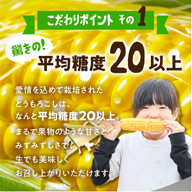 食べる人を想って愛情を込めて栽培されたとうもろこしは平均糖度20前後。