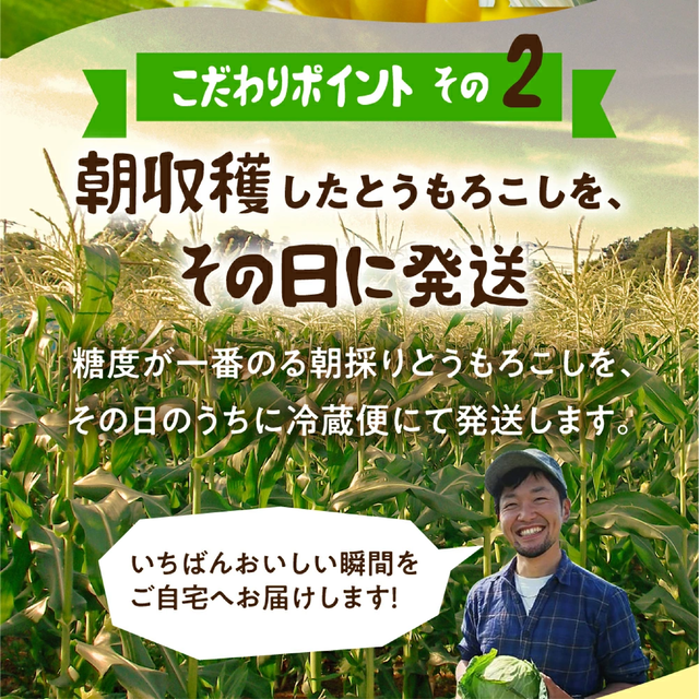 鮮度が大事なとうもろこしを少しでも美味しく食べてもらえるように、糖度が一番のる朝採りしたとうもろこしをすぐに冷蔵便で発送。