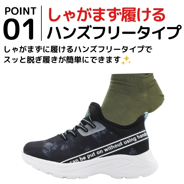手を使わずにスッと履けるハンズフリーシューズで脱ぎ履きの手間がなく簡単快適です。
