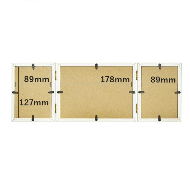 | サイズ | ・外寸(見開き時) [縦]約146mm/[横]約421mm/[奥行]約13mm ・内寸(左・右) [縦]約127mm/[横]約89mm ・内寸(中央) [縦]約127mm/[横]約178mm ・窓寸(左・右) [縦]約120mm/[横]約82mm ・窓寸(中央) [縦]約120mm/[横]約171mm ・マット(ポスト版窓寸) [縦]約92mm/[横]約142mm ※中央はマットを外すと2L判(127mm×178mm)までの作品を入れられます。 ※サイズはメーカー公表サイズです。実際の商品とは多少の誤差が生じる場合がございます。あらかじめご了承ください。 |