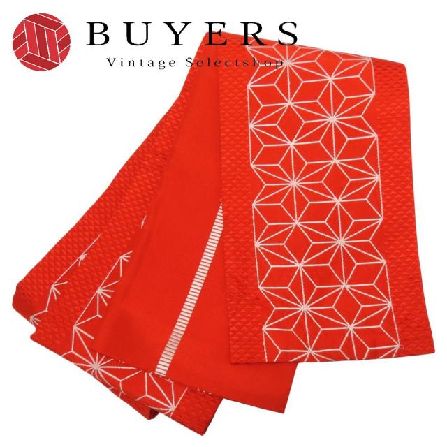 中古 半幅帯 正絹 レッド 麻の葉模様 レトロ おしゃれ 和装 呉服 和服 きもの レディース 女性