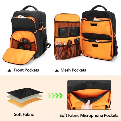 【収納力抜群】2つのフロントジッパーポケットは、ヘッドフォン、スマホ、財布などを収納できます。2番目のコンパートメントには大きなフラップポケットが2つとメッシュポケットが5つあり、マイク、ケーブル、オーディオインターフェイスなどを収納できます。専用のパッド入りラップトップスリーブには15.6インチのラップトップを収納でき、バックル付きサイド ポケットにはマイクアームを収納できます。