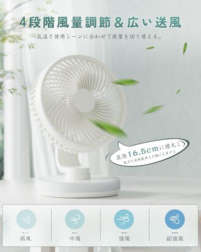 【4段風量調節&広範囲送風】この卓上扇風機は、4段階の風量調節が可能で、さまざまなシーンにぴったり対応します。静かな読書やリラックスタイムには優しい弱風、中程度の風量で日常的に快適に過ごせ、暑い日には強風・超強風で瞬時に涼しさを実感できます。ファンの直径は16.5cmと一般的な卓上扇風機よりも大きく、広範囲にわたって風を送り、より効率的に涼しさを届けます。
