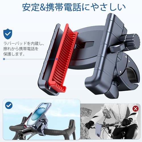 【安定している&スマホの保護者】この携帯電話スタンドは良質なABSプラスチックを採用し、精密ねじ鋼、堅牢で安定しており、耐震性がある。携帯電話スタンドにはラバーパッドが内蔵されており、拭きや滑りから携帯電話を全方位に保護します。ハンドルクリップは最新バージョンの軍用クラスのバイオニックワニクリップを採用し、滑り止めのシリカゲルマット付きで、ハンドルをしっかり固定することができ、揺れる道路を走っても落下せず、より鋭利な旋回や急ブレーキをかけることができる。