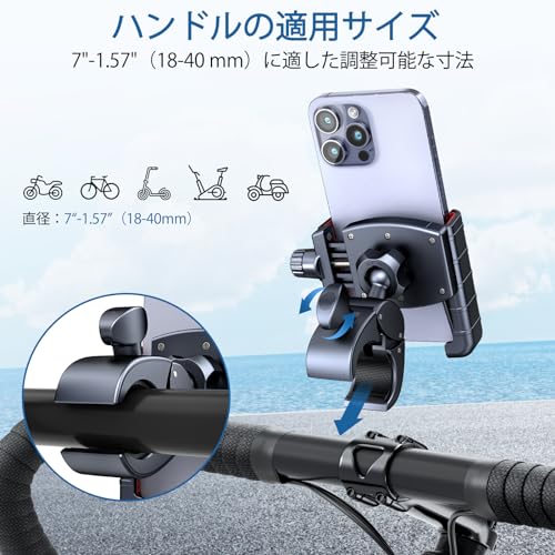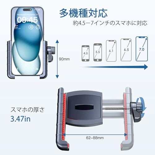 【多車種対応&多機種に対応】この自転車スマホホルダーの幅は、直径2.4インチから3.4インチ(62〜88 mm)までのすべてのデバイスに対応しており、携帯電話の対角線寸法は4.5インチから7インチまで。