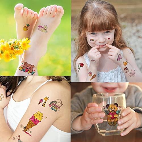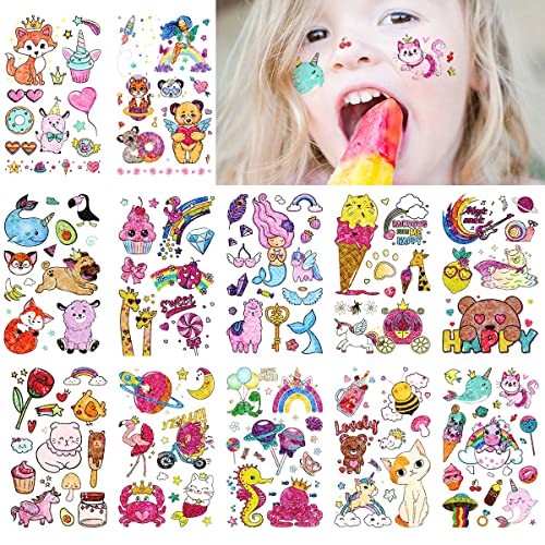 子供タトゥーシール キラキラ: 12枚キラキラと活気のある子供の漫画のタトゥーシール、7.5・12CM/枚、ユニコーン、キツネ、キリン、人魚姫、風船、虹、マジックワンド、ダイヤモンド、ロリポップ、ドーナツ、アルパカ、クマ、アイスクリーム、ドーナツ、猫、ひよこ、バラ、蝶、蜂、タコ、タツノオトシゴ、コアラ、カニ、フラミンゴなど。一時的なボディ・デコレーションセットです。小さいで魅力的なデザインになりました。