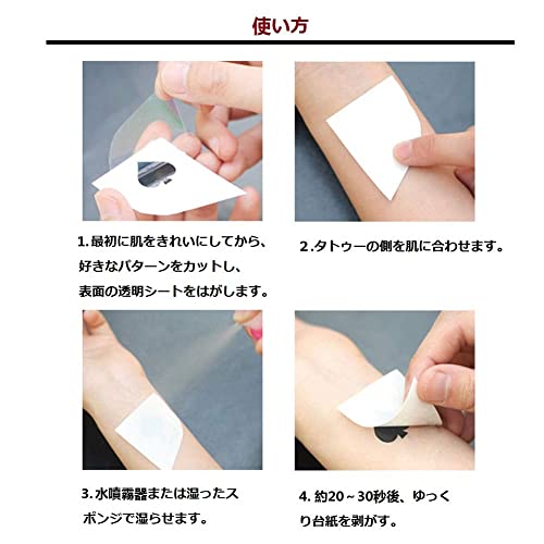 簡単&長持ち:水だけで10〜20秒で簡単に貼れ、石鹸、ボディオイルなどをこすると簡単に剥がせます。3-5日間は防水で長持ちするので、お風呂や水泳でも心配ありません。