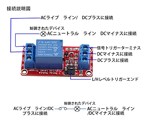 本商品はジャンパー線を使い、トリガーレベルをL/Hに設置することができ、リレーをONさせる時のリレーコントロール入力信号(IN)の極性を選ぶ事が出来ます。