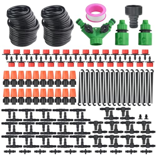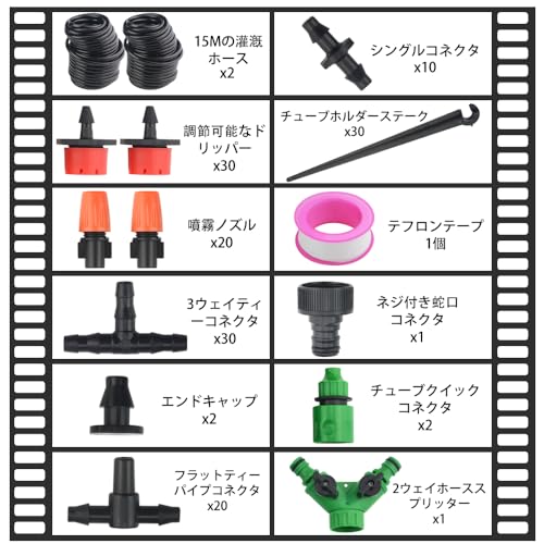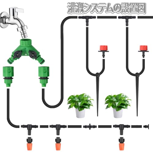 【パッケージ内容】点滴灌漑キットには、15Mの灌漑ホース2個、調節可能