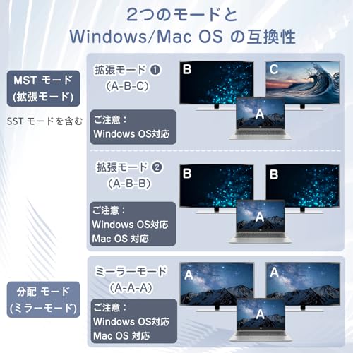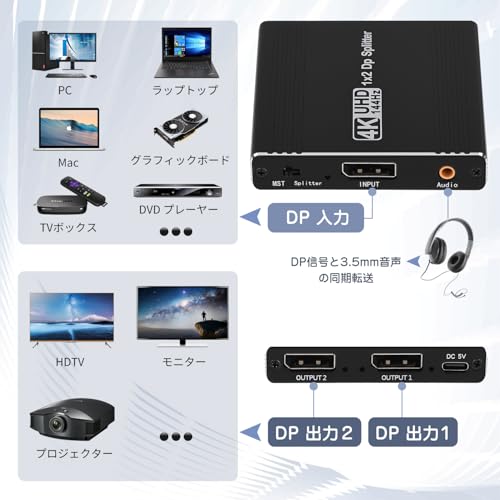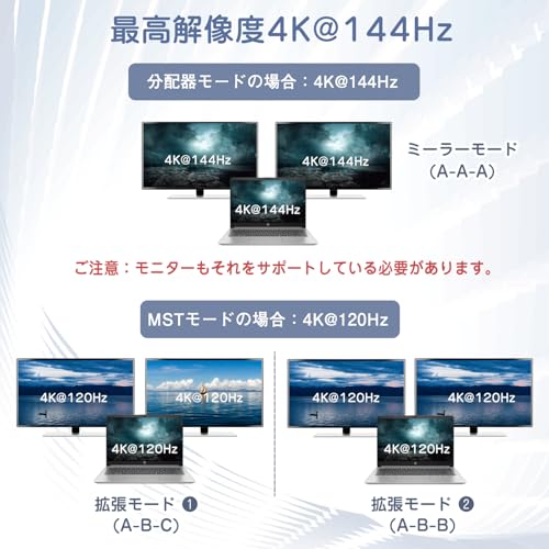 DisplayPort 分配器 1入力2出力 DPスプリッター MSTハブ 4K@144Hz 120Hz 60Hz サポート 拡張 モード ミラーモード DisplayPort 1.4 ハブ デュアルモニター