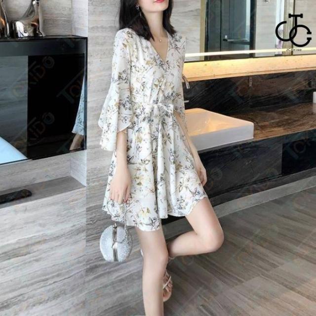 ミニワンピース ミニ丈 レディース ワンピース 大人 可愛い お出かけ デート 花柄 プリント 七分袖 夏 総柄 20代 30代 長袖 シフォン フレア Aライン 2色
