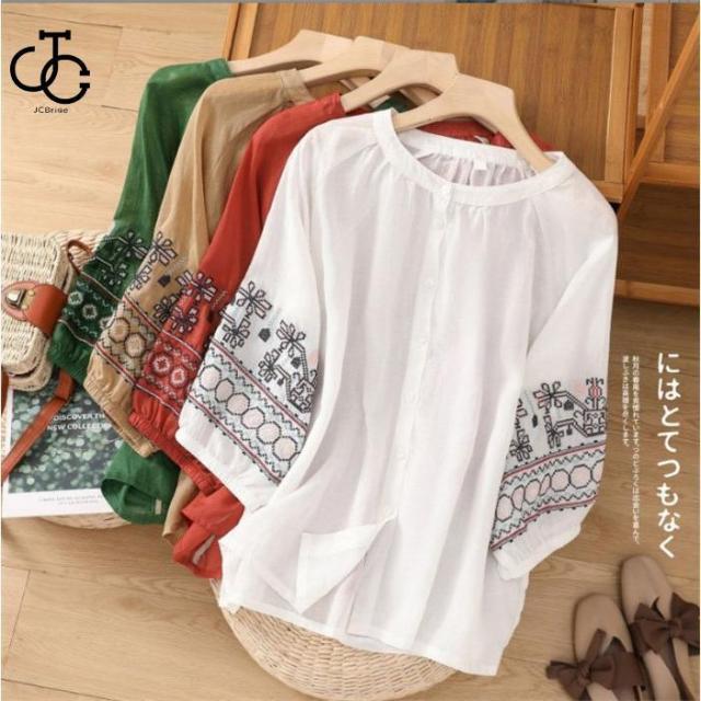 ブラウス トップス シャツ 半袖 レディース チュニック 半袖シャツ 夏 花柄 刺繍 無地 5分袖 カットソー 体型カバー 綿麻 コットンリネン フレア ゆったり 大きいサイズ 40代 50代 可愛い 大きいサイズあり シンプル 上品 着回し コットン 可愛い シンプル 30代 40代 50代