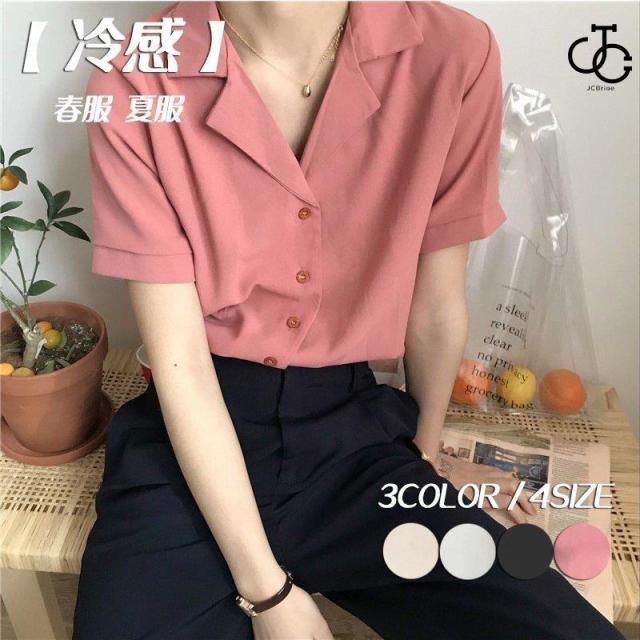 【冷感】 シンプル 開襟シャツ 半袖 レディース トップス シャツ ブラウス ベーシック オフィス デイリー 通勤服 春服 夏服 ゆったり オープンカラー 無地