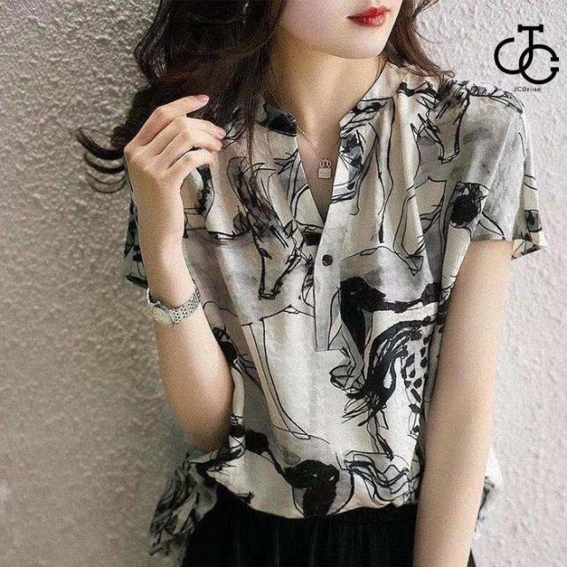 ブラウス レディース 40代 春夏新作 オシャレブラウス シフォンブラウス プリント Vネックブラウス 上品 半袖トップス 韓国風 大人 通勤 ゆったりシャツ 30代