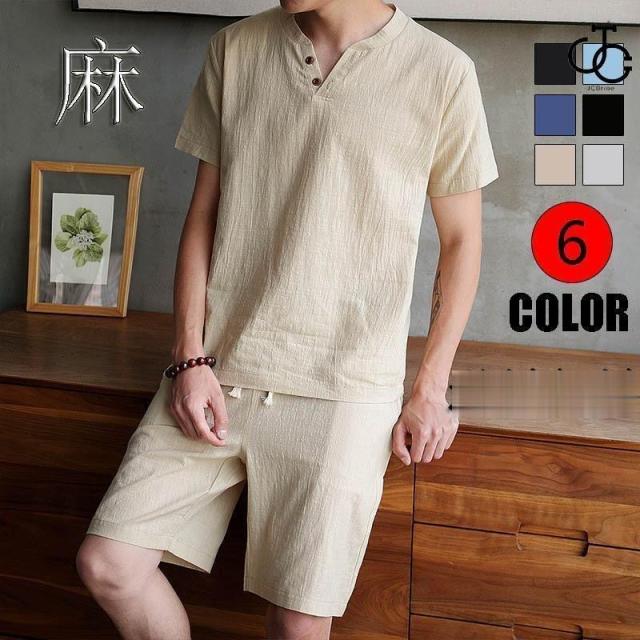 上下セット Tシャツ 短パン セットアップ 2点セット 半袖 麻 メンズ 上下 夏 涼しい 部屋着 ルームウェア トップス ボトムス ショートパンツ ズボン