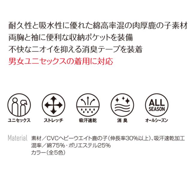 ハードな環境下でのワークシーンでパフォーマンスを発揮する耐久性の高い肉厚の綿高混率プロダクト。