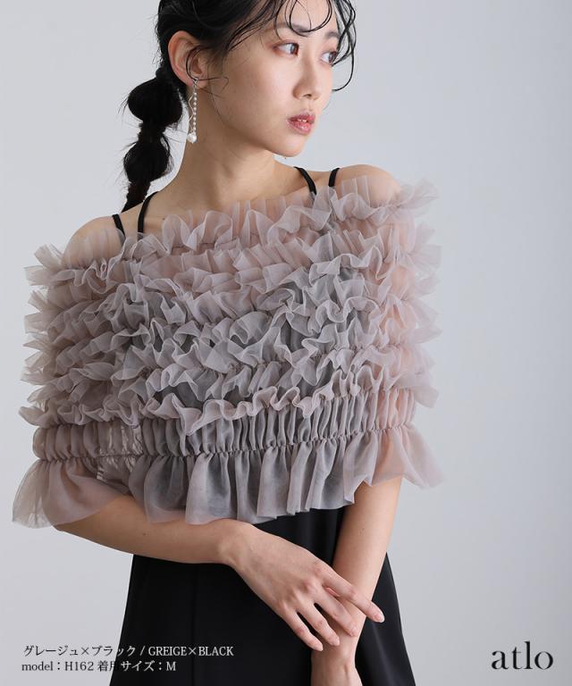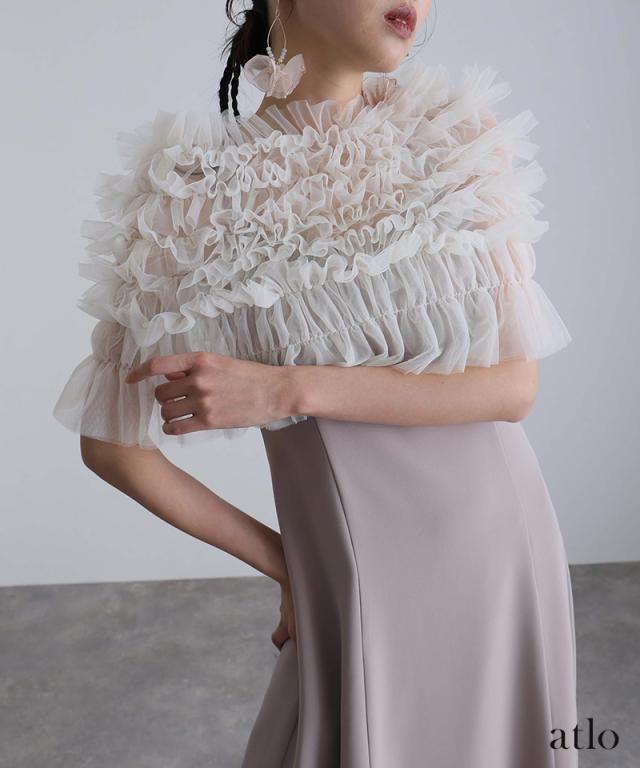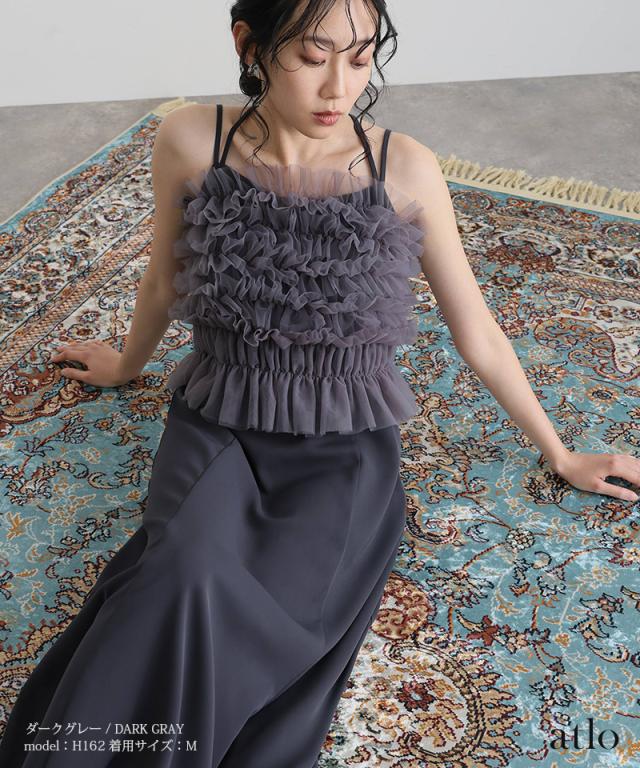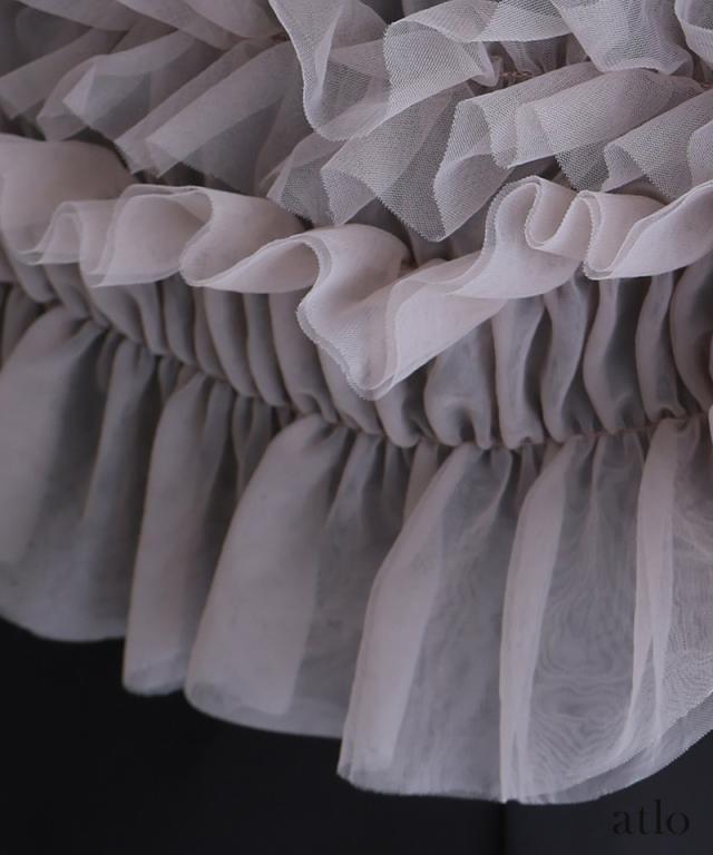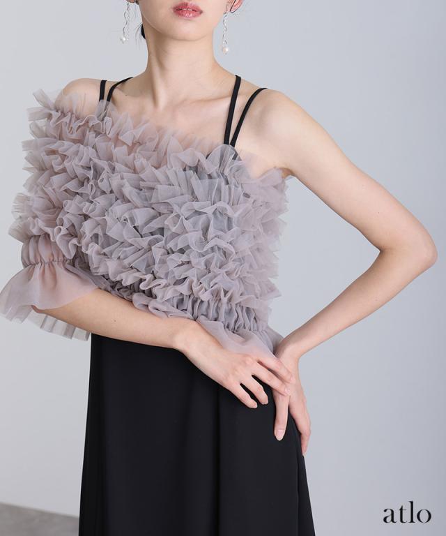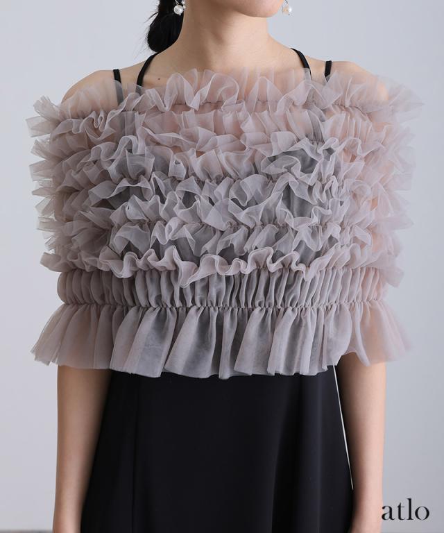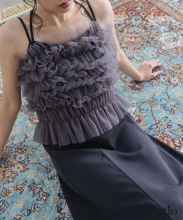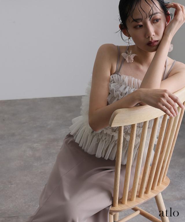 チュールをたっぷりと使用し、透け感にこだわったトップスが華やかでエレガントな印象に。