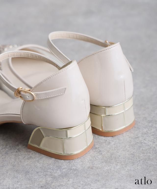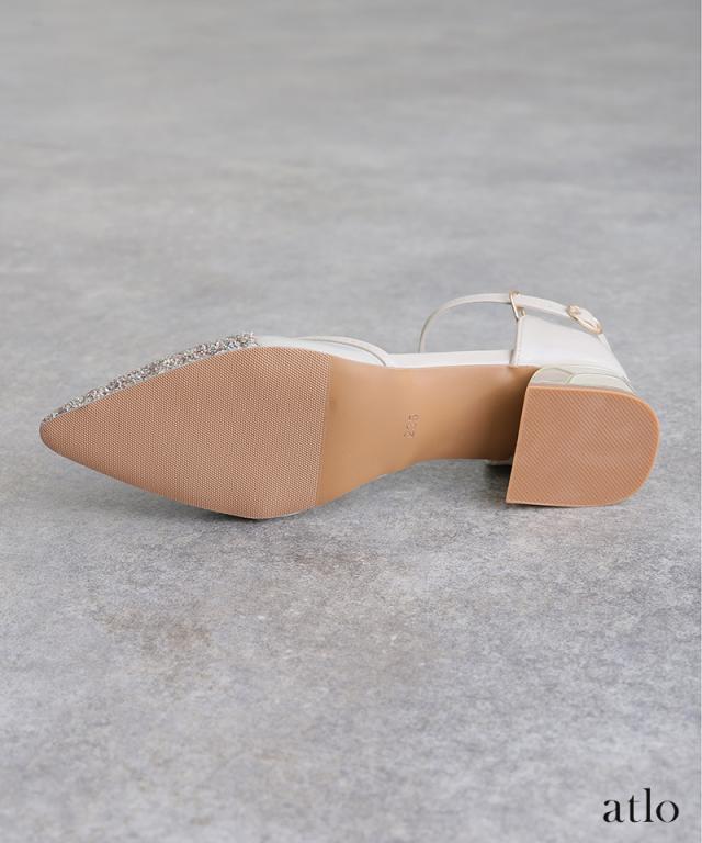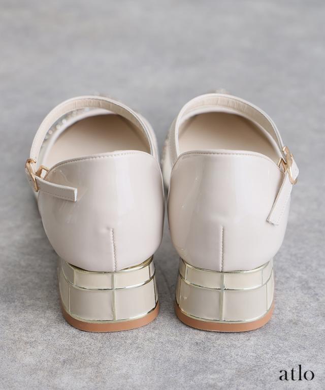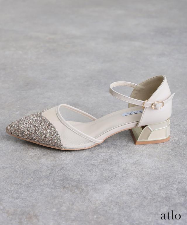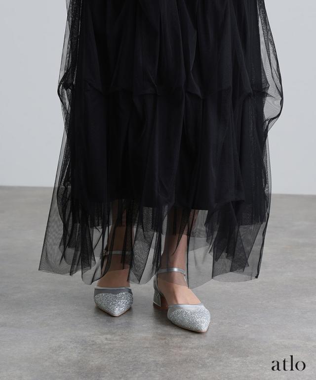 グリッターとハードチュールの透け感が可愛いチャンキーヒールパンプス。