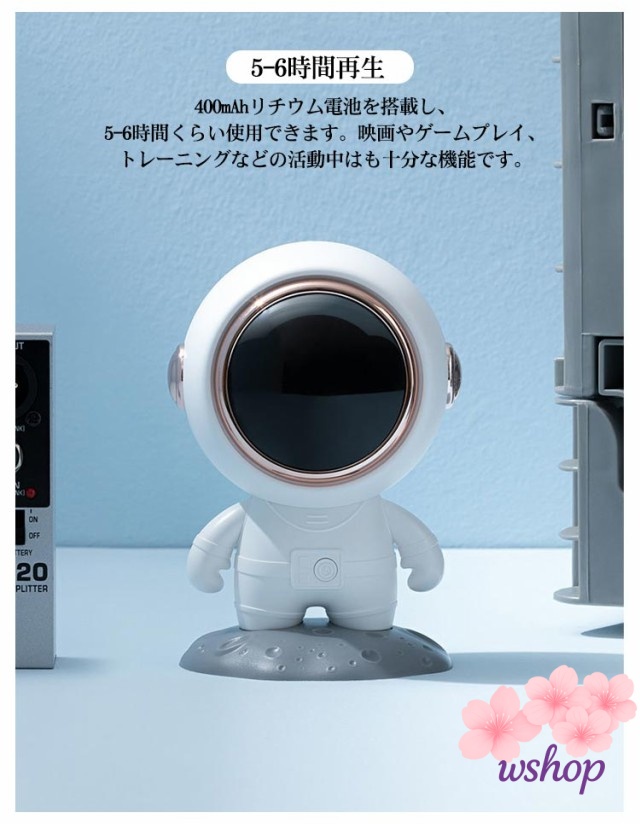 | かわいい宇宙飛行士型のBluetoothスピーカー!Bluetooth対応のあらゆるデバイスと接続出来ます。 【ワイヤレス接続】iPhone/iPod/iPad/スマートフォン/タブレット等、Bluetooth対応のあらゆるデバイスと接続出来ます。更に、最後に使用したデバイスに自動接続もできます。 【5-6時間再生】400mAhリチウム電池を搭載し、5-6時間くらい使用できます。映画やゲームプレイ、トレーニングなどの活動中はも十分な機能です 【Bluetoothバージョン5.0】このポータブルスピーカーはBluetooth5.0で完全なワイヤレスを実現し、より高速なBluetooth接続とより安定的な接続範囲を提供します。 【3w出力】小さい体で3wの音量が出してます、一人楽しめる娯楽時間としてはとても十分な出力です。部屋の隅々まで広げます。 大切な方の誕生日や記念日の贈り物、ご自身へのご褒美にも最適です。 | |