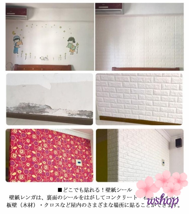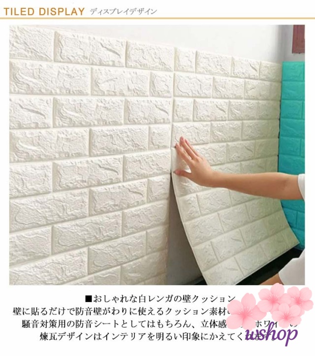 | ■おしゃれな白レンガの壁クッション 壁に貼るだけで防音壁がわりに使えるクッション素材の壁紙シートです。 騒音対策用の防音シートとしてはもちろん、立体感のあるホワイトの煉瓦デザインはインテリアを明るい印象にかえてくれます。 ■防水でお手入れ簡単♪ お洒落な3Dの壁クロスは防水性のあるポリプロピレン製の日用雑貨です。 トイレ・キッチン(台所)・洗面所・浴室の周辺など水回りにも使え、拭くだけで汚れもスッキリ取ることができます。 ※のり付き壁紙は、防カビ加工は施されていません。 ■どこでも貼れる!壁紙シール 壁紙レンガは、裏面のシールをはがしてコンクリート・石壁・タイル・板壁(木材)・クロスなど屋内のさまざまな場所に貼ることができます。 | |