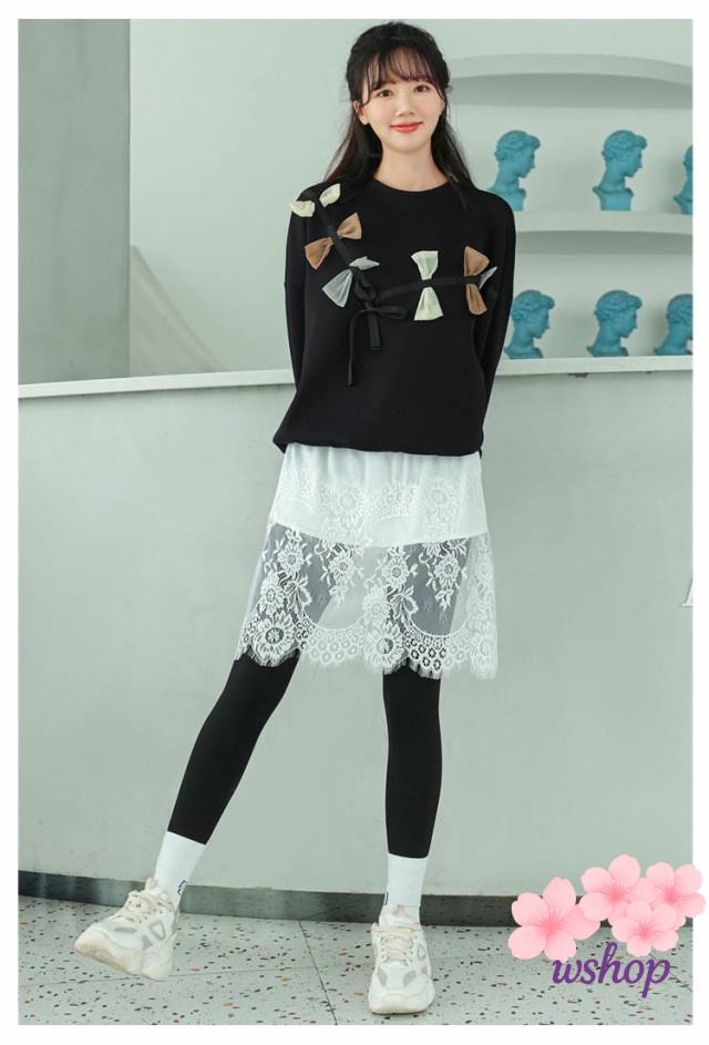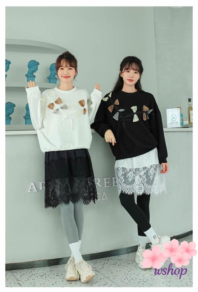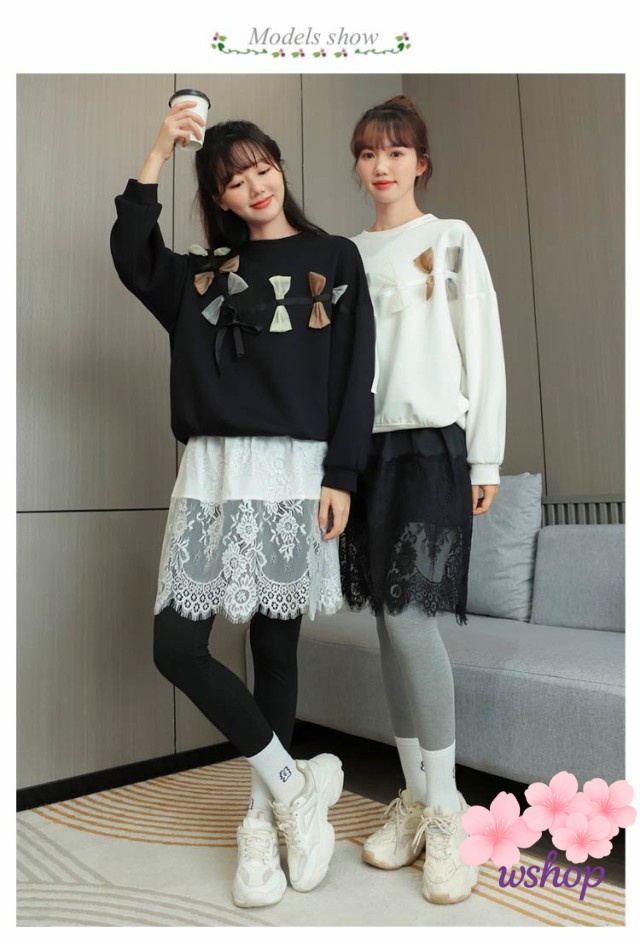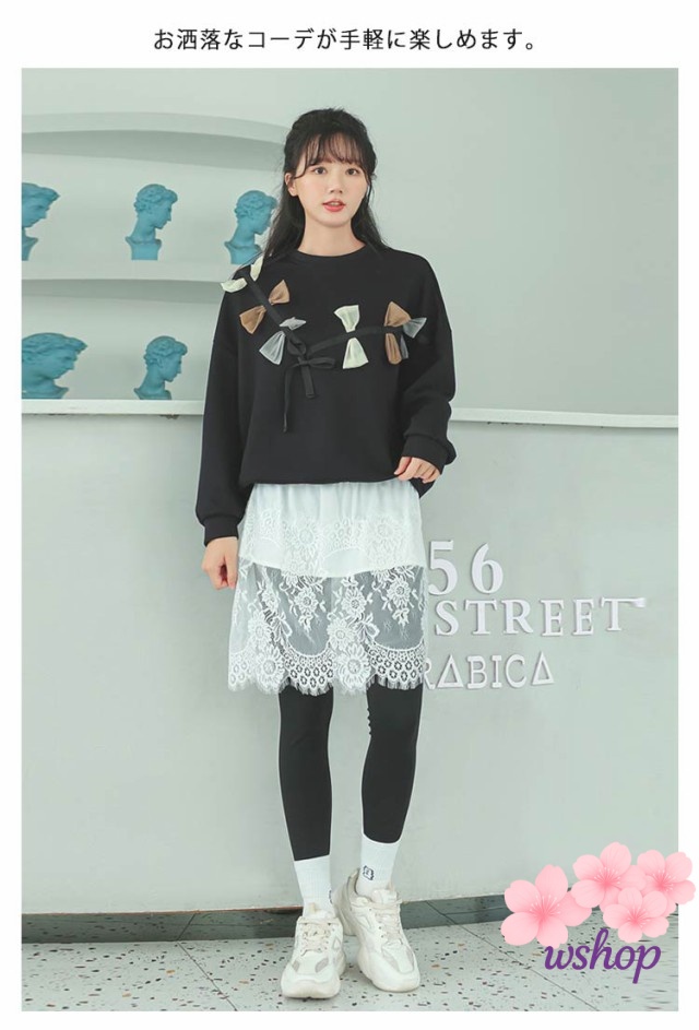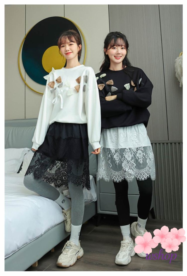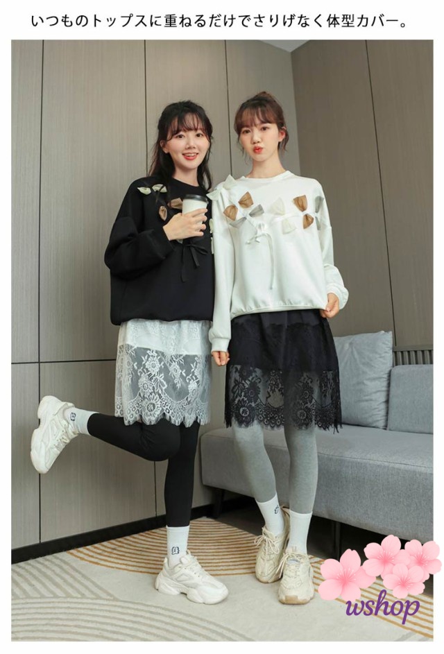 【wshop】送料無料 レイヤード シャツ 黒 ミニスカート インナー 上品 白 大人 スウェット ブラウス つけ裾 トップス 付け裾 重ね着風 レース ウエストゴム Tシャツ レイヤードカットソー トップス 総レース 裾フレア カットソー かわいい