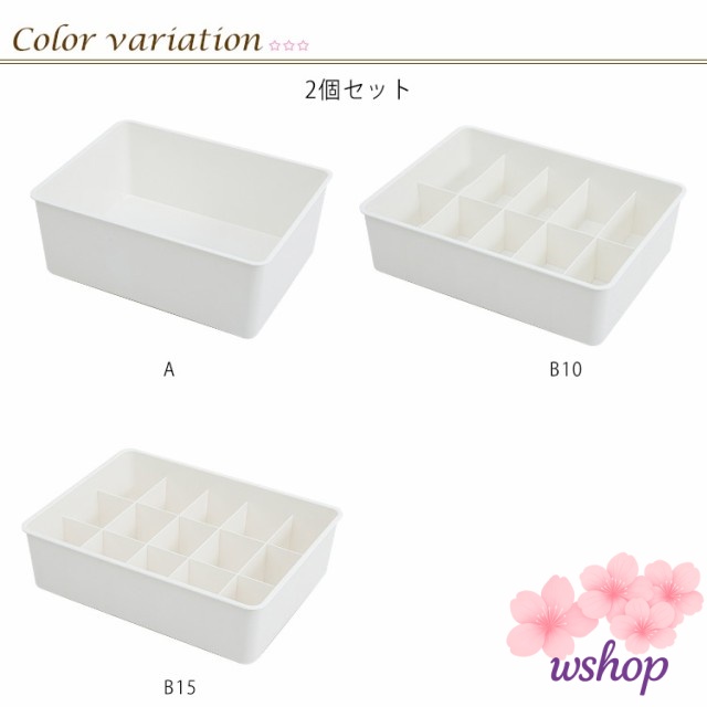 | 取りやすくて見た目もキレイに!フタ付き下着収納ボックス2個セット 安心なフタ付きでホコリも入らず安心♪ 積み重ねもできて、引き出し以外でも収納できます。 汚れたら水洗いもできてる便利なプラスチック製、耐摩耗性にも優れています。 15仕切りタイプは下着類、10仕切りタイプにはソックス類、仕切りなしタイプはブラジャーなど用途に合わせて組み合わせ可能です。 | |