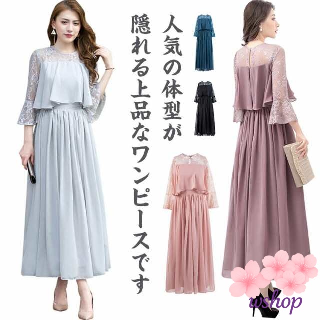 【wshop】ロング丈 春 秋冬 40代 ミセス 冬 ロングドレス 結婚式 体型カバー 二の腕カバー レース ワンピース 50代 フォーマルドレス 袖あり 母親 20代 着痩せ 成人式 お呼ばれ パーティードレス 秋 同窓会 30代