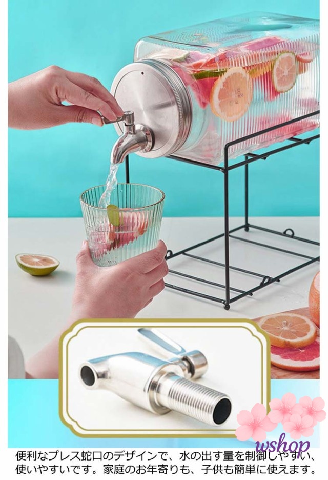 | ガラス&ステンレス製3L大容量ピッチャー。【横置き】 容量は3Lで、ご自宅の冷蔵庫にも保管できる小ぶりなサイズです。 密閉性が高いので、冷蔵庫の棚には横にして置けてもOK! ボトル容器の口部分は、大きめの作りなので果物やお花なども入れやすくお手入れがしやすいのもポイントです。 便利なプレス蛇口のデザインで、水の出す量を制御しやすい、使いやすいです。家庭のお年寄りも、子供も簡単に使えます。 | |