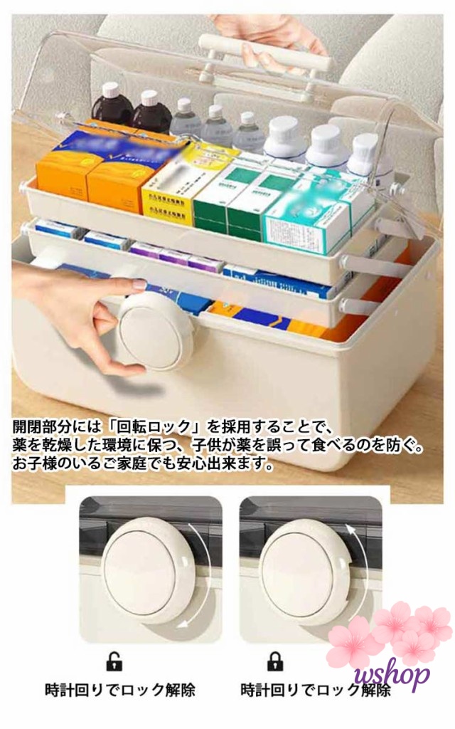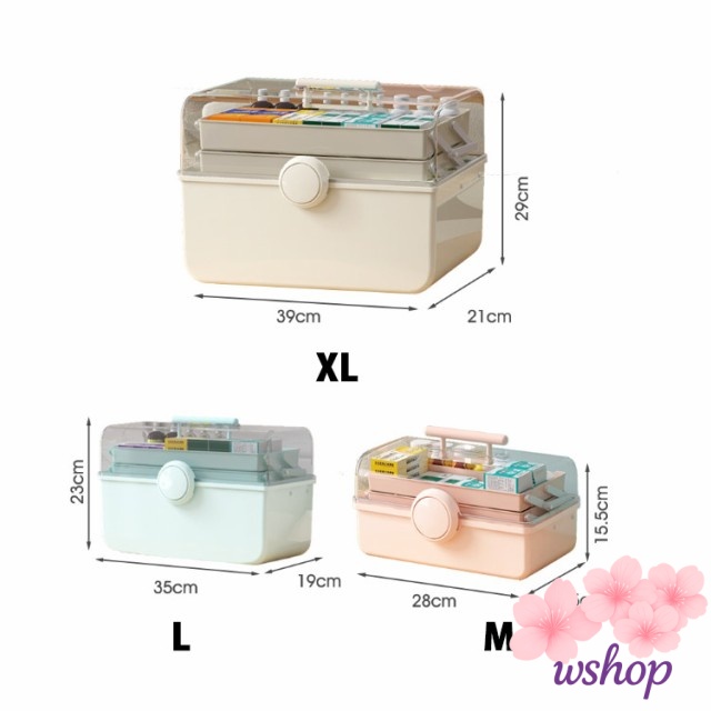 | M/L/XLサイズ選べる 3段式設計&仕切りがあるから上手に収納!! おしゃれで便利な大容量収納ケース ・軽量のPP素材で環境保護ができて耐久性もあります。長持ちで、防虫、防黴、防湿で、非常に耐久性がある。 ・3層トレーと仕切りで薬類をお好みで分類出来るので欲しい物が一目瞭然。 ・上段は仕切りあるトレー付きなので、小さなお薬等の小分けに便利です。薬を探す手間が省けます。 ・下段には高さのある瓶やボトルもたっぷり収納できます。底の左右は分別に引き出しが付いています。 ・フタが透明になっているため開けることなく中身がハッキリ見えます。 ・また、180度開けることができ、隠されたハンドルのデザインは移動や持ち運びが簡単で、万が一急な災害が起きた時でも、慌てることなく対応できます。 ・開閉部分には「回転ロック」を採用することで、薬を乾燥した環境に保つ、子供が薬を誤って食べるのを防ぐ。お子様のいるご家庭でも安心出来ます。 ・しっかり閉められるので持ち上げる際にフタが開いて中身が落ちる心配もありません。 ・薬箱だけでなく、化粧品や文房具も収納できます、透明ケースなので内容物が一目瞭然です! ・家族、病院、診療所、アウトドア、事務所など用に、常備薬をまとめてコンパクトに収納出来る救急箱です。 | |