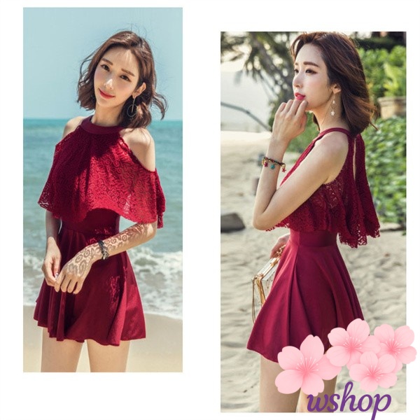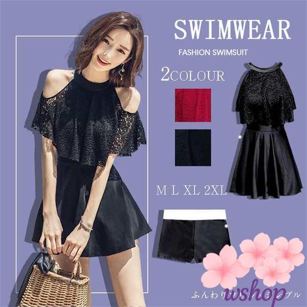 上品なレース2wayオフショルワンピ♪後ろは背筋を可憐に魅せる! 水着体型カバー オフショルワンピ オールインワン水着 ワイヤーあり ホルターネック かわいい お洒落 華奢 見せ 黒
