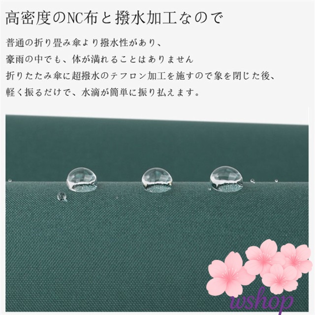 ★超撥水性:高密度のNC布と撥水加工なので、普通の折り畳み傘より撥水性があり、豪雨の中でも、体が濡れることはありません。折りたたみ傘に超撥水のテフロン加工を施すので傘を閉じた後、軽く振るだけで、水滴が簡単に振り払えます。