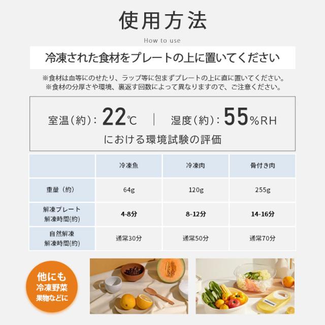 当プレートの使用は驚くほどシンプルで、肉をプレートに置くだけ! 環境にやさしく、省エネな解凍方法を提供し、解凍中のバクテリアの繁殖を抑制し、食材の栄養価と肉汁を保ちます。