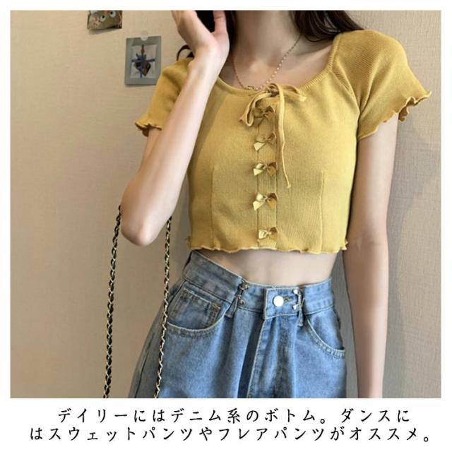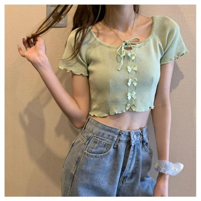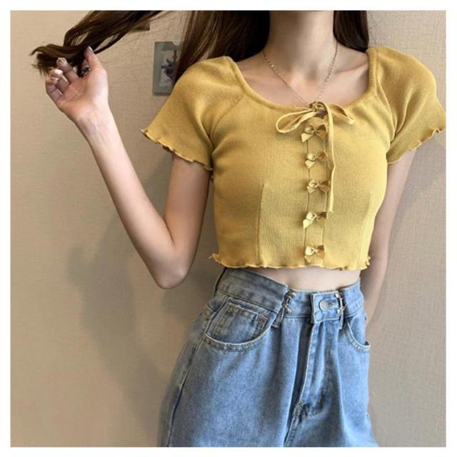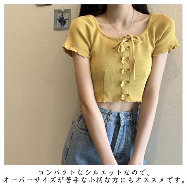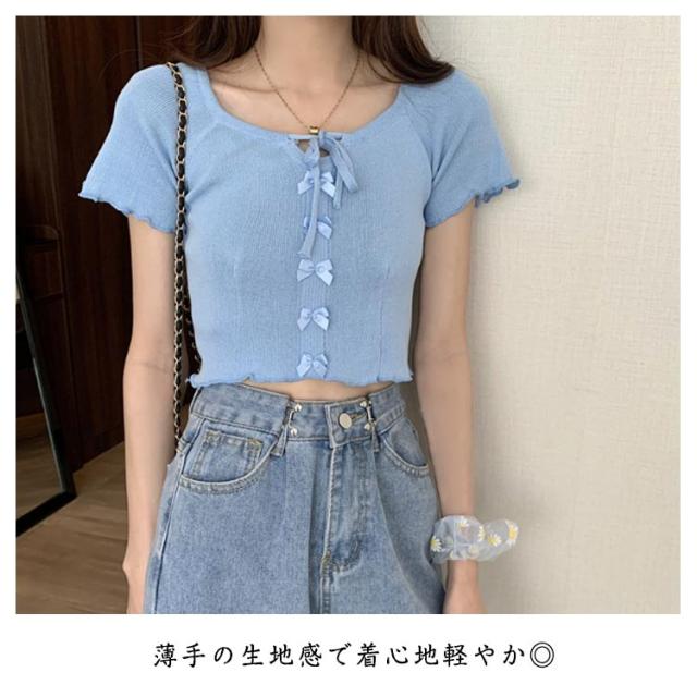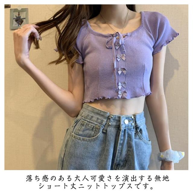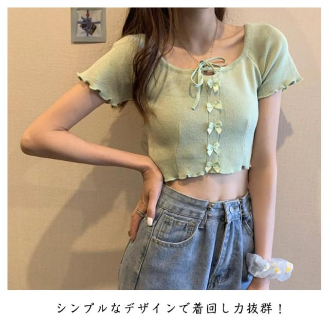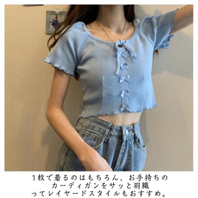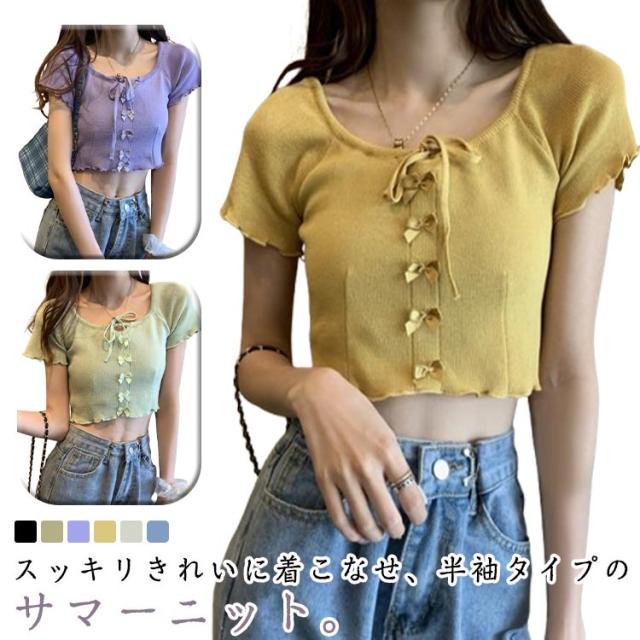 uネック ニット クロップド丈 レディース セクシー Tシャツ 半袖tシャツ 半袖tシャツ カットソー ショート丈 夏 秋 無地 夏服 カジュアル 薄手 可愛い キュート きれいめ おしゃれ 韓国ファッション INS風 重ね着