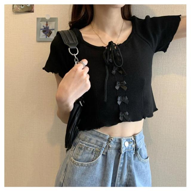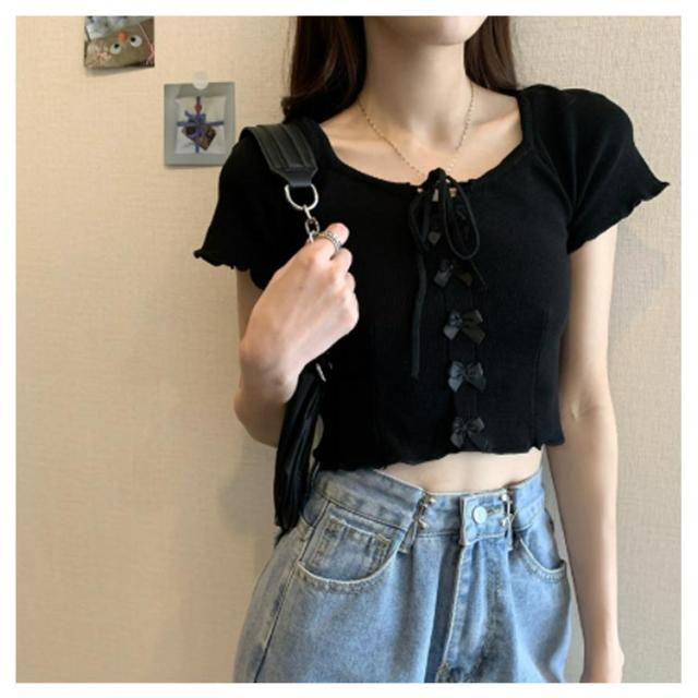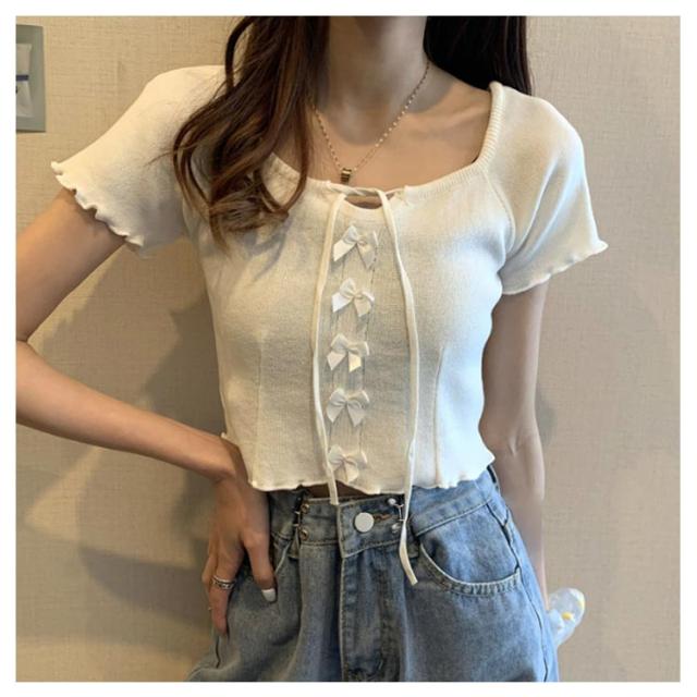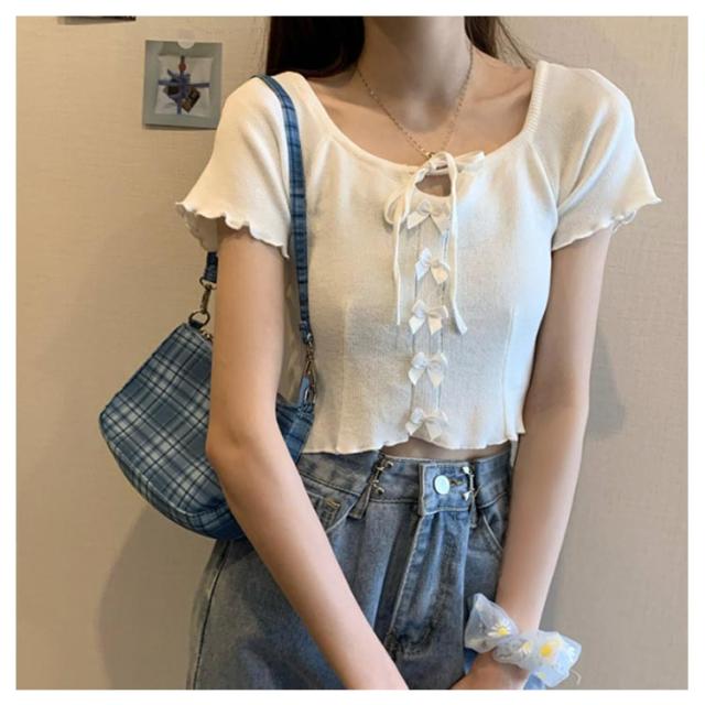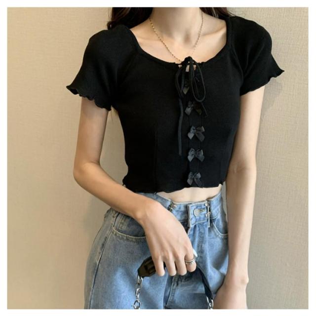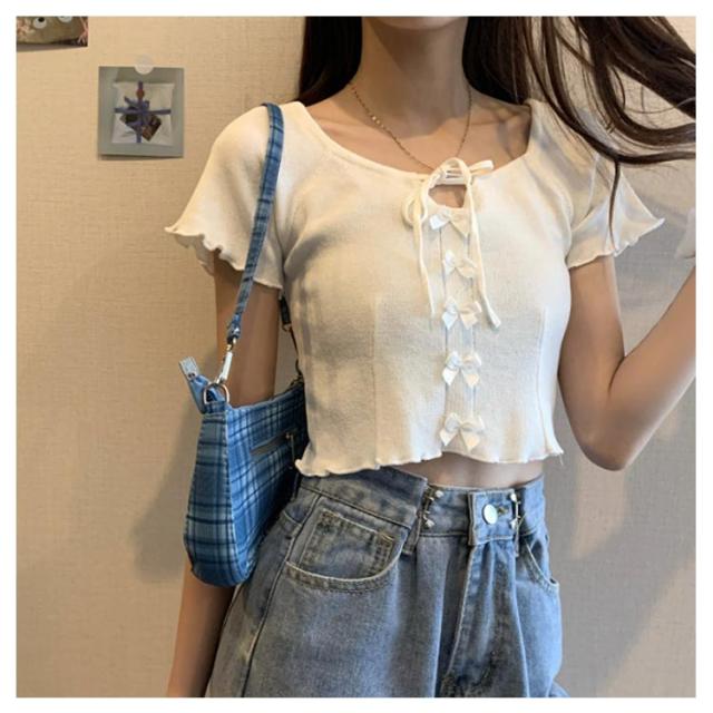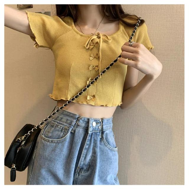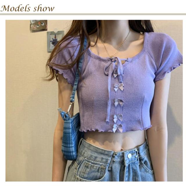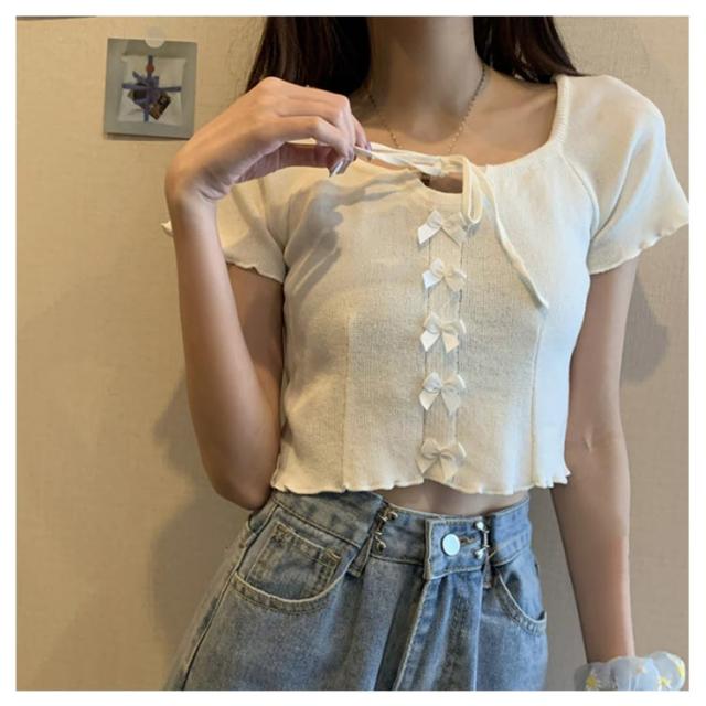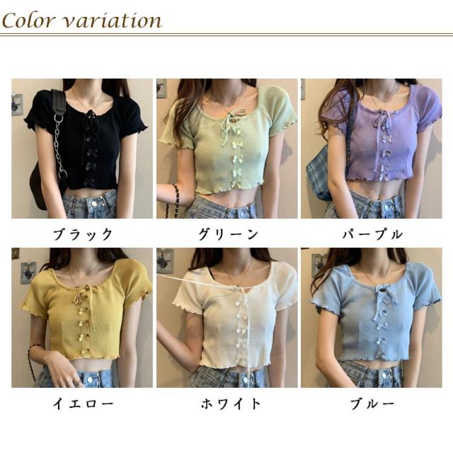 uネック ニット クロップド丈 レディース セクシー Tシャツ 半袖tシャツ 半袖tシャツ カットソー ショート丈 夏 秋 無地 夏服 カジュアル 薄手 可愛い キュート きれいめ おしゃれ 韓国ファッション INS風 重ね着