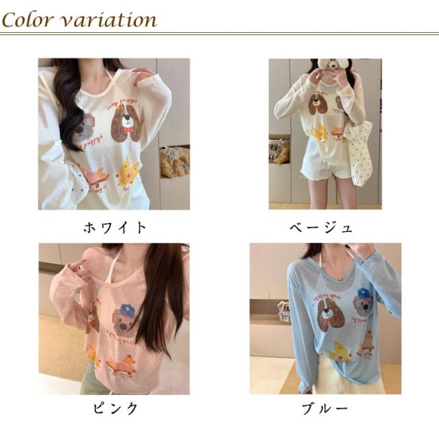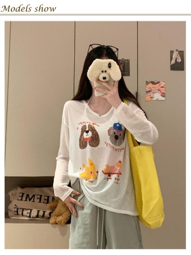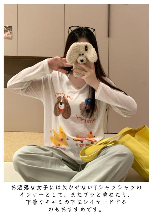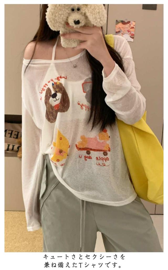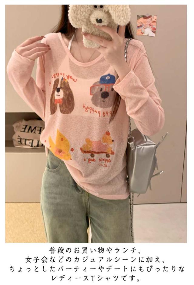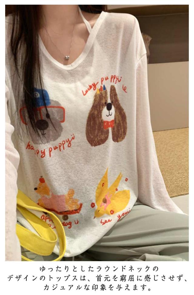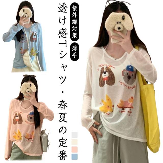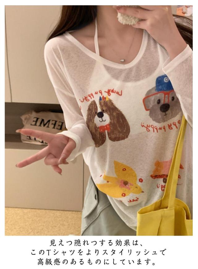 tシャツ シアートップス シアー 長袖 シアーT 夏 シアートップス プリント 犬柄 可愛い おしゃれ レディース シアーカットソー ゆったり 薄手 紫外線対策 冷房対策 透け感 重ね着 レイヤード カジュアル お出かけ 旅行