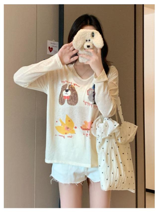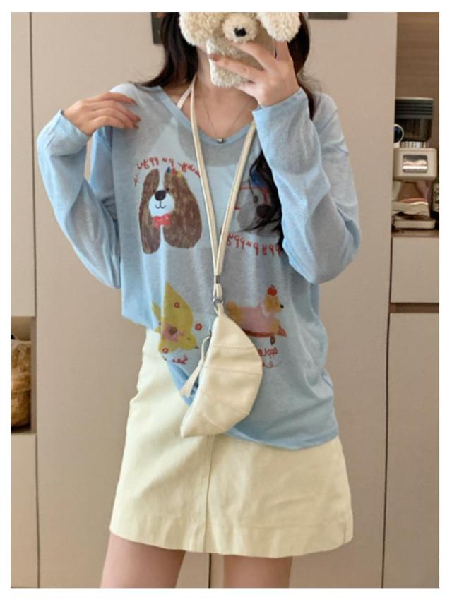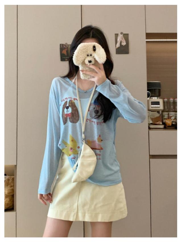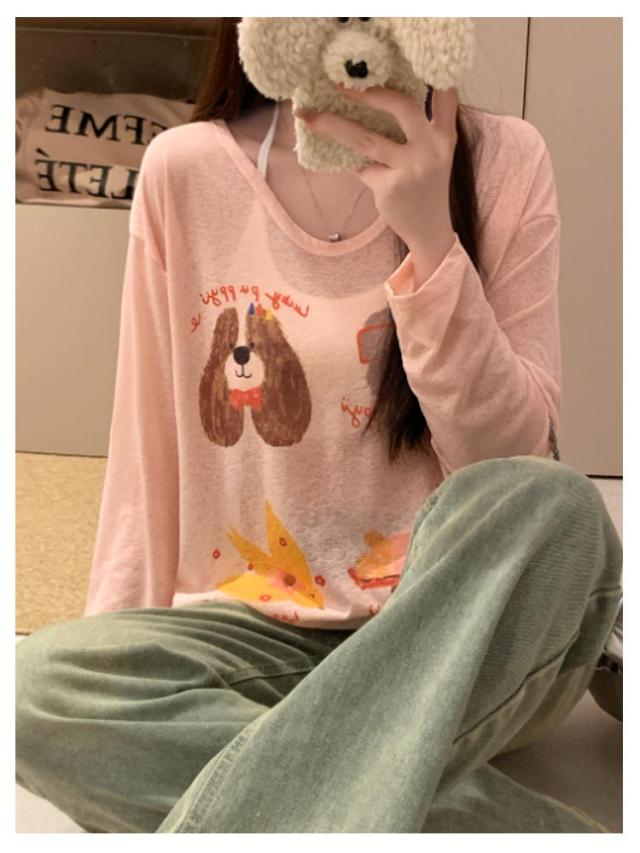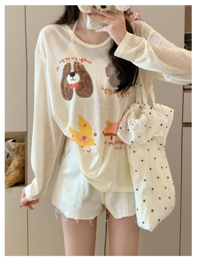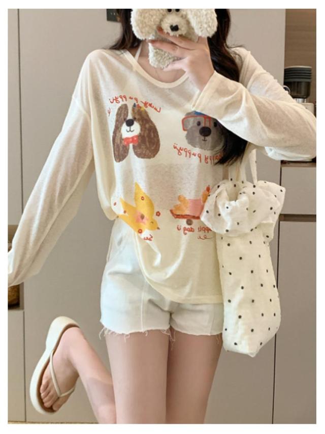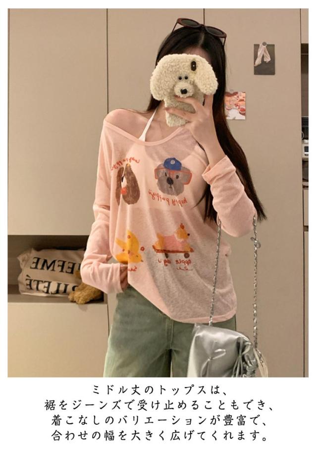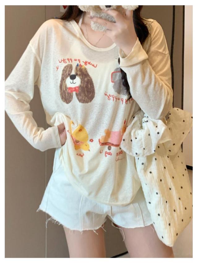 tシャツ シアートップス シアー 長袖 シアーT 夏 シアートップス プリント 犬柄 可愛い おしゃれ レディース シアーカットソー ゆったり 薄手 紫外線対策 冷房対策 透け感 重ね着 レイヤード カジュアル お出かけ 旅行