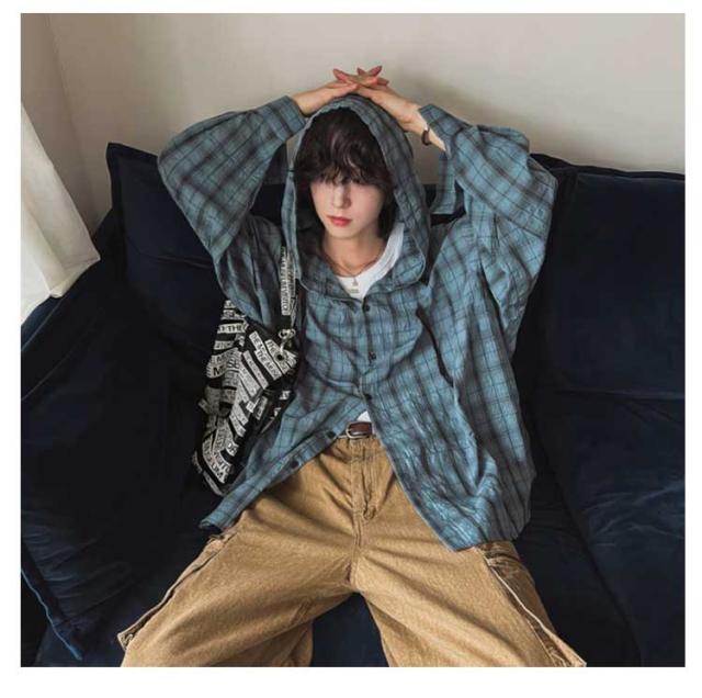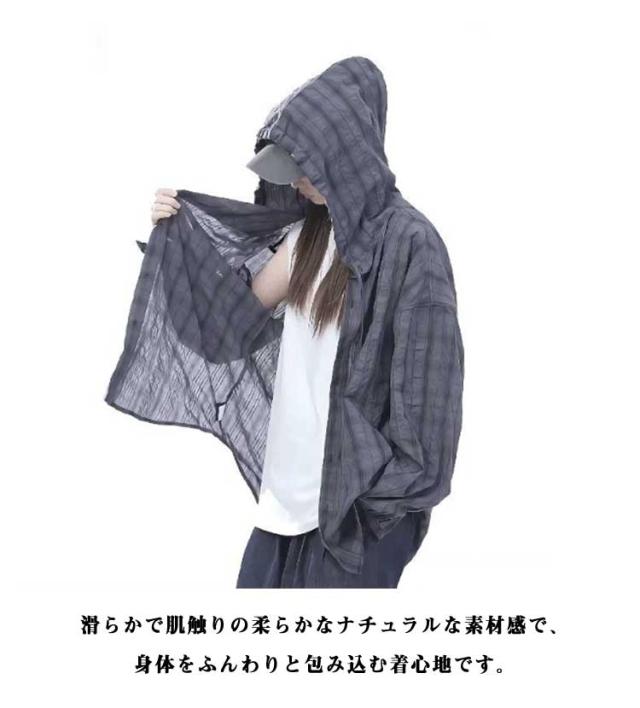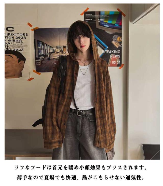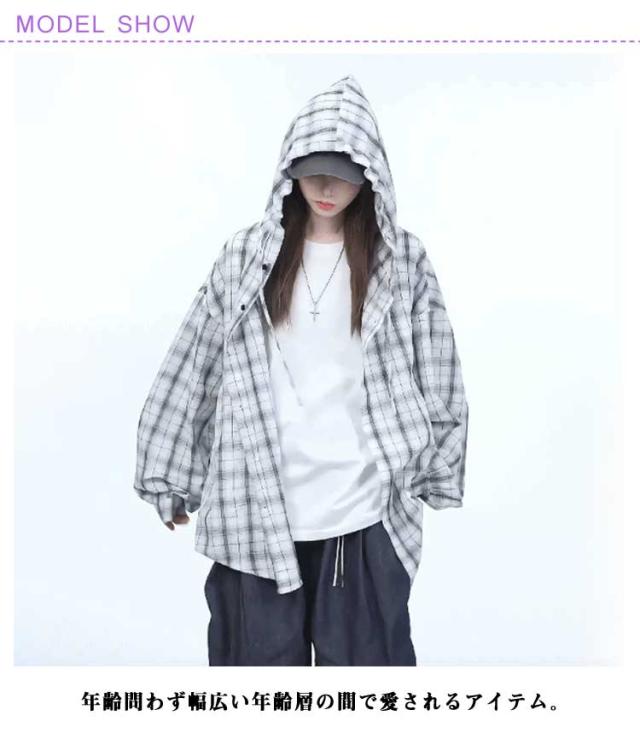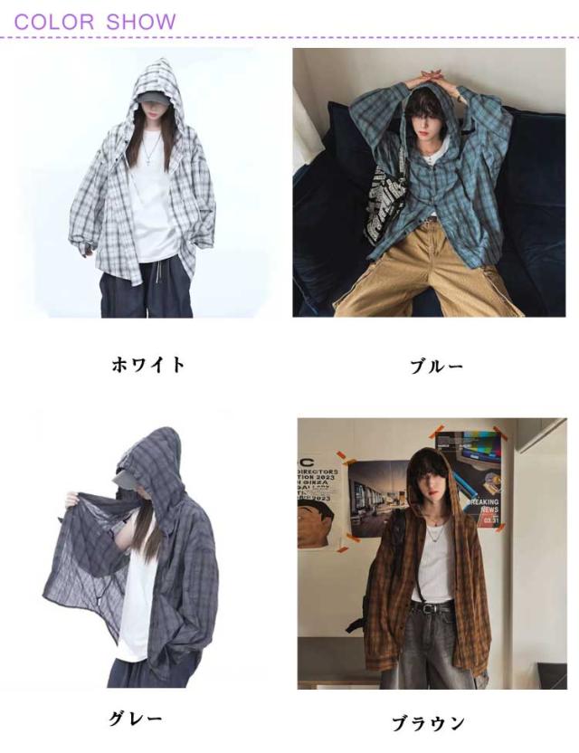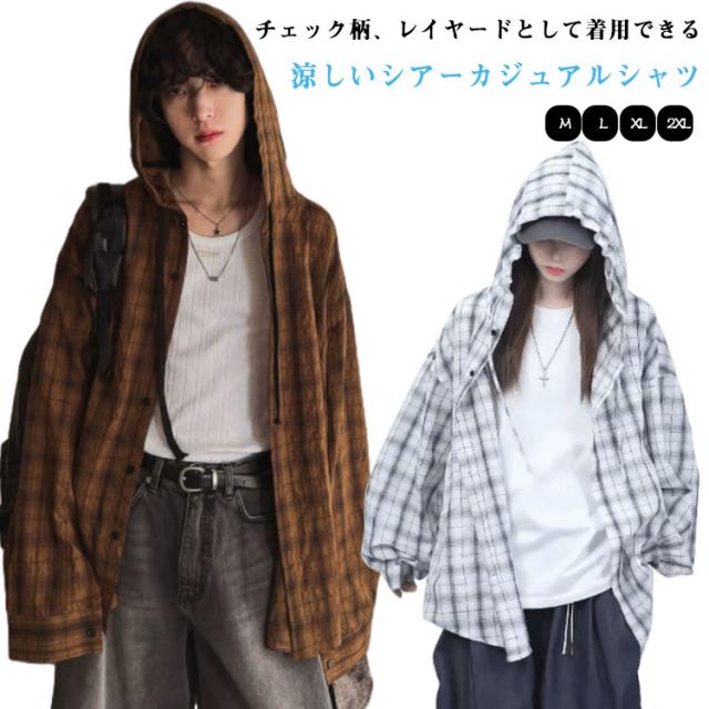 チェック柄 前開き M 紫外線対策 チェック柄 レディース メンズ シャツ カジュアルシャツ ブルゾン カーディガン フード付き 薄手 ライトアウター シャツジャケット アメカジ レトロ シアーシャツ L XL