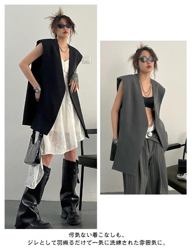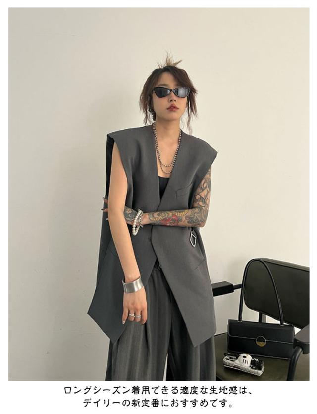 ジレ レディース 春 夏 ロング テーラードベスト ベスト ロングベスト テーラード スーツベスト ノースリーブ Vネック ジャケット シンプル 羽織り 前開き 無地 カジュアル 通勤 オフィス フォーマル エレガント きれいめ 黒 灰 ブラック グレー 20代 30代 40代
