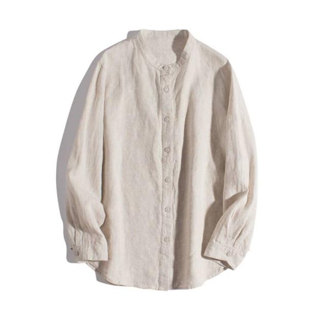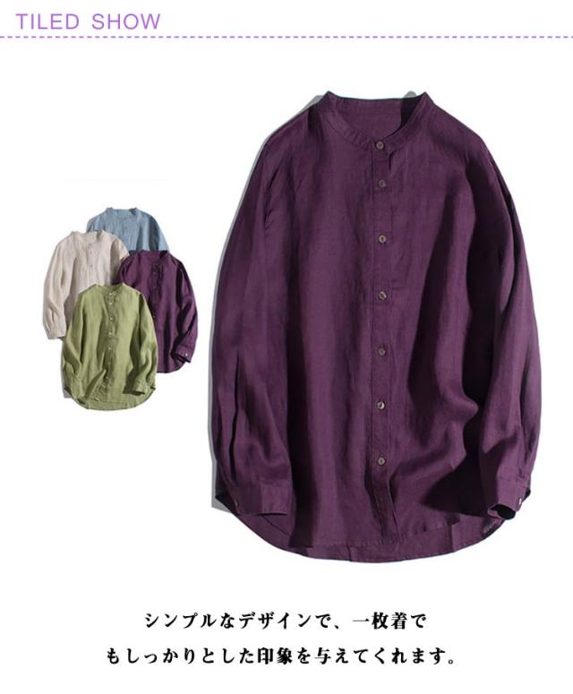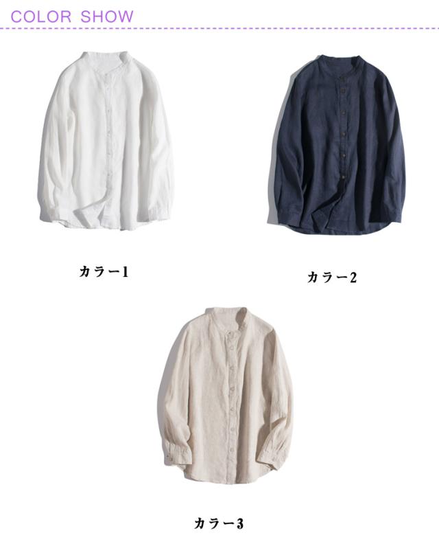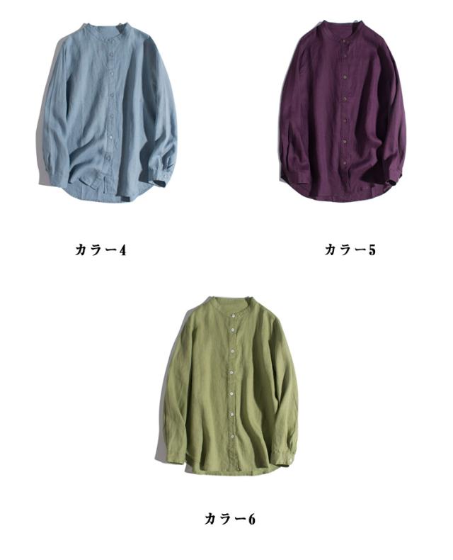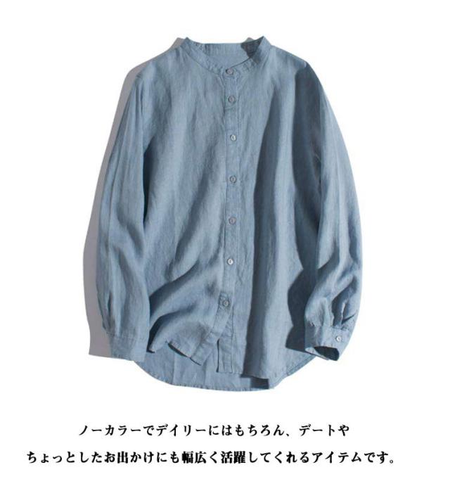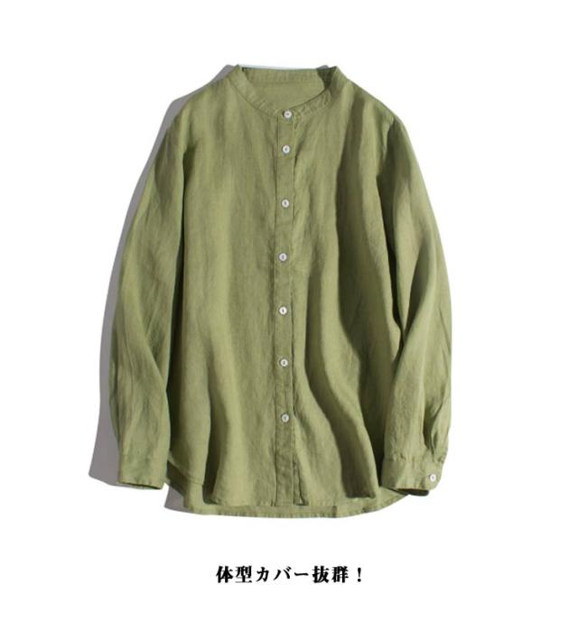 長袖 レディース リネンシャツ リネン シャツ ノーカラーシャツ 着痩せ 麻 綿麻シャツ 長袖シャツ スタンドカラー 上品 綿麻ブラウス 綿麻 森ガール シンプル きれいめ リネン M
