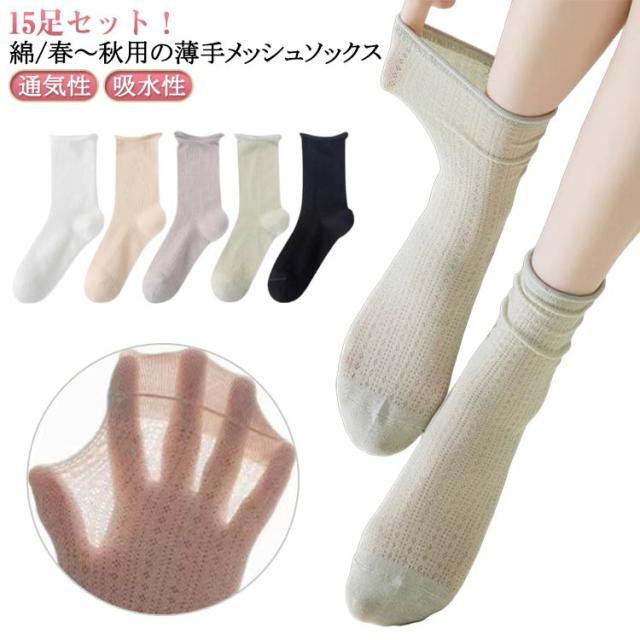 靴下 レディース 春夏 夏用 涼しい 薄手 22-25cm ソックス 女性 ソックス メッシュ 春秋 メッシュソックス 通気性 吸水性 クルー丈 ずれにくい さわやか 綿混素材 ずれにくい 涼しい シンプル 無地 蒸れない 15足セット くつした 長め丈 婦人 手編み風