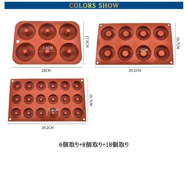 | 3個セット。 3タイプ!6個取り/8個取り/18個取り!シリコン ドーナツ型 揚げずにヘルシードーナツが簡単に焼けるシリコーン型。 生地がくっつきにくいシリコーン製。 | |
