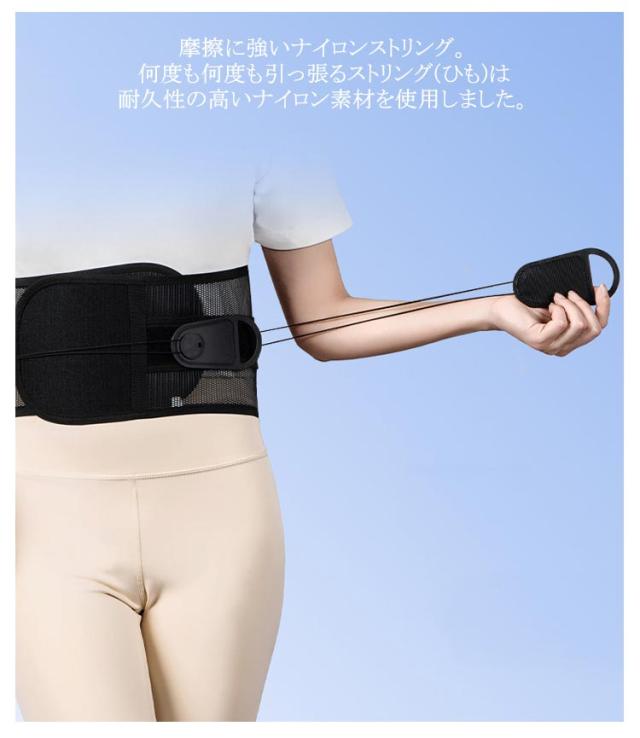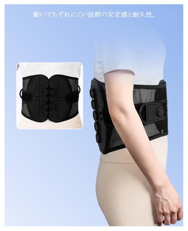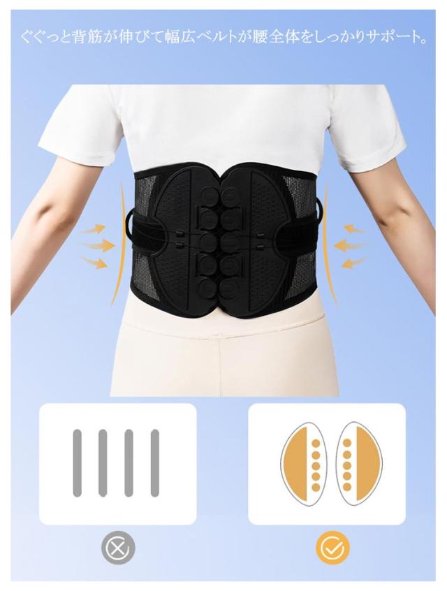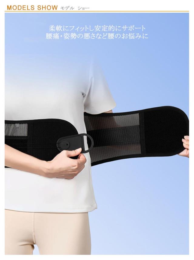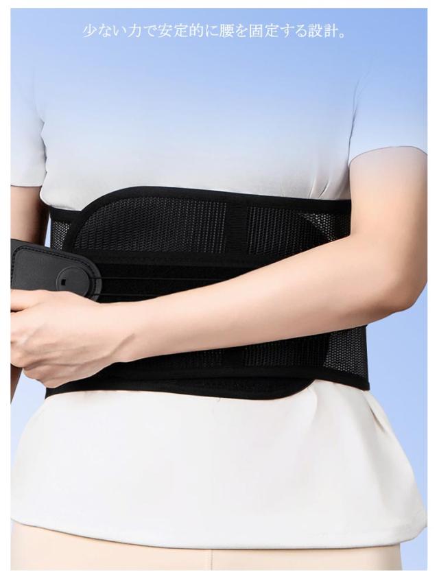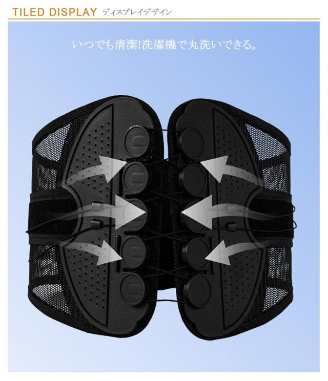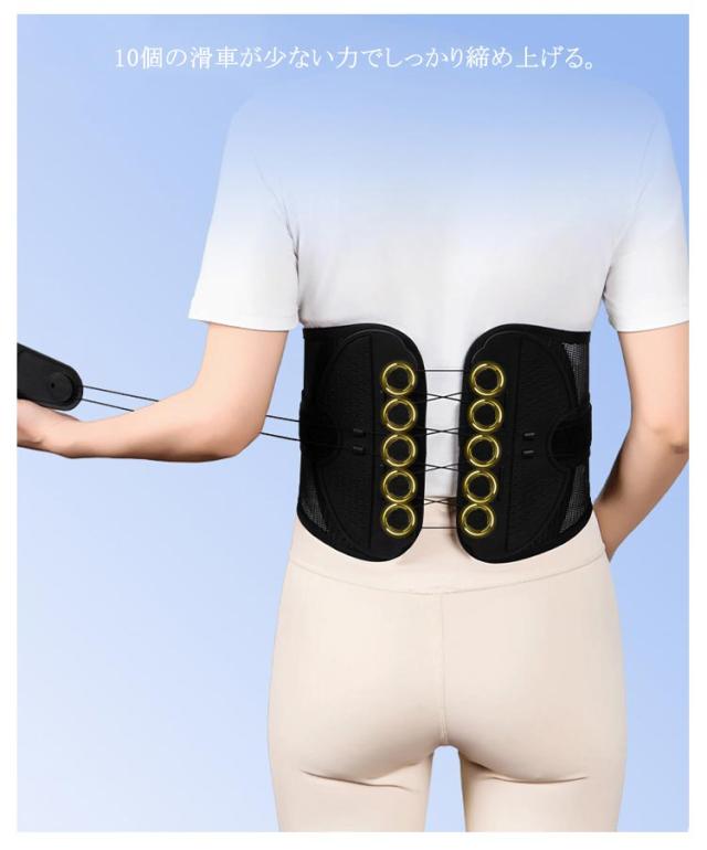 | 腰・骨盤ベルト 腰・骨盤をしっかりサポート! 柔軟にフィットし安定的にサポート 腰痛・姿勢の悪さなど腰のお悩みに 腰痛改善 反り腰・猫背改善 産後の骨盤矯正 腰・骨盤ベルトで本来の正しい姿勢へ 少ない力で安定的に腰を固定する設計 動いてもずれにくい抜群の安定感と耐久性 軽くて蒸れにくい高品質のメッシュ素材 ぐぐっと背筋が伸びて幅広ベルトが腰全体をしっかりサポート 10個の滑車が少ない力でしっかり締め上げる 摩擦に強いナイロンストリング 何度も何度も引っ張るストリング(ひも)は耐久性の高いナイロン素材を使用しました。 いつでも清潔!洗濯機で丸洗いできる | |
