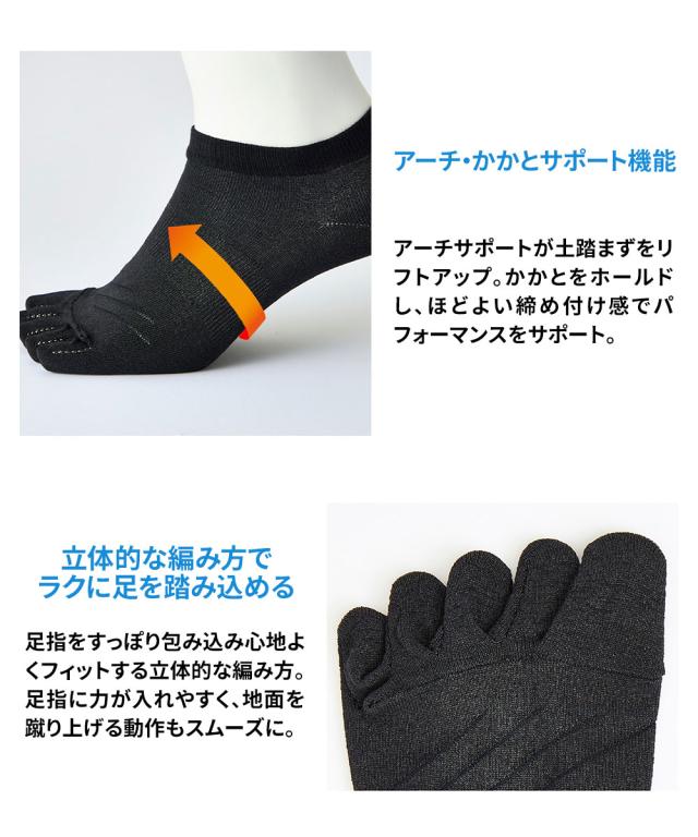 ほどよい締め付けでパフォーマンスをサポート。足指に力が入れやすく、地面を蹴り上げる動作もスムーズに。