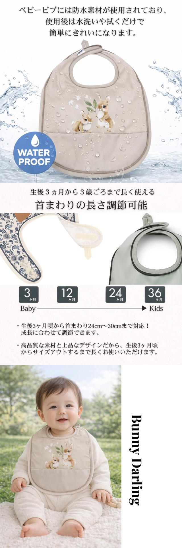 首周りは着け外しのしやすいマジックテープ式で、調節も可能。3ヶ月の赤ちゃんから成長に合わせてお使いください。