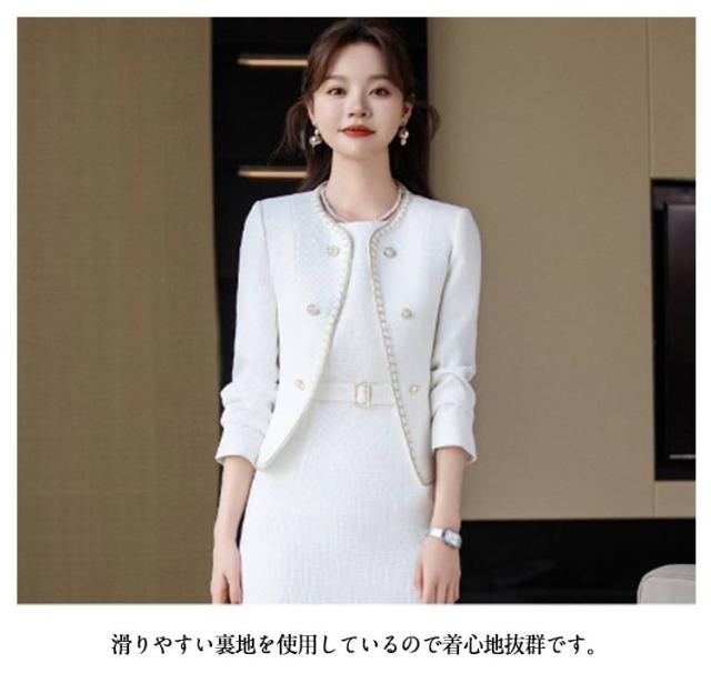 | パールボタン&パイピングデザインがポイントジャケットはフォーマルシーンで大活躍! カッチリとしたきちんと感と柔らかい女性らしさを持ち合わせた、Iラインシルエットが美しいレディーススーツセット。 コサージュやパールなどを合わせて卒業式(卒園式)や入学式(入園式)、結婚式などのお呼ばれにはもちろん!オフィスカジュアルとしても着用できる1着です。 ネックラインはゆとりのある空き具合。すっきりした首回りはアクセサリーとも相性抜群♪ ジャケットは窮屈なイメージを覆す、着心地抜群のサイズ感 ワンピースはシンプルなIラインシルエットで気になる腰回りを自然にカバー! 滑りやすい裏地を使用しているので着心地抜群です。 セットアップで入学式や卒業式などのセレモニーや学校行事、七五三やお宮参りなどのフォーマルシーンに最適。 シンプルなワンピースはカーディガンなどをあわせてオフィススタイルにも着用いただけます。 | |