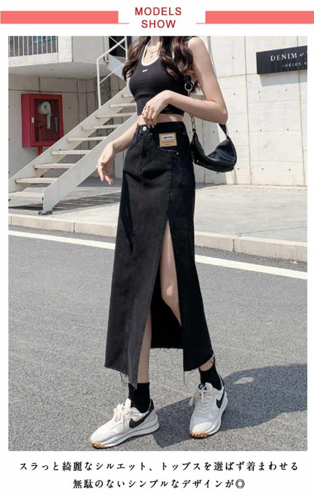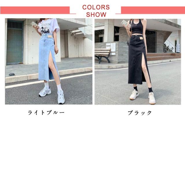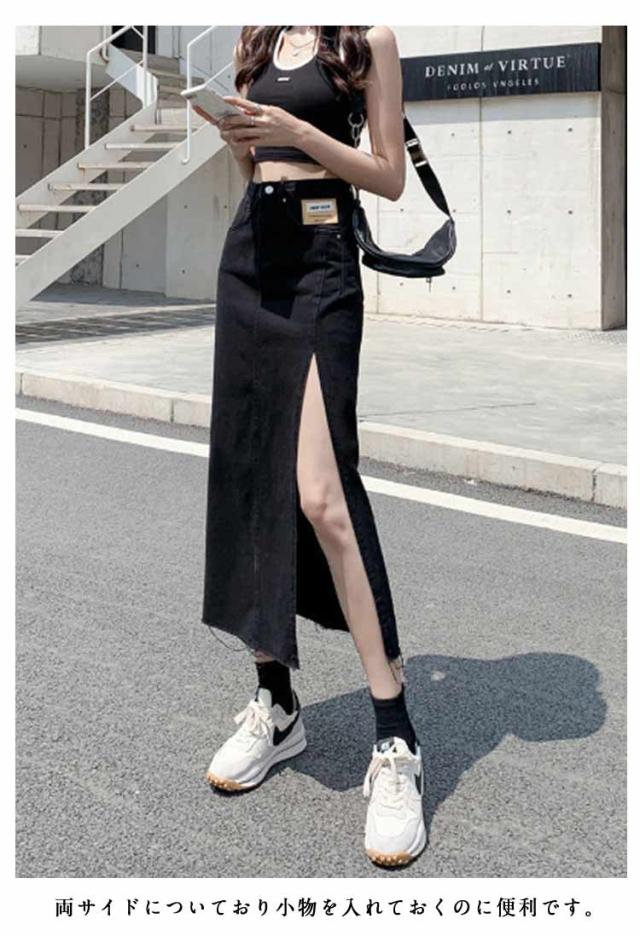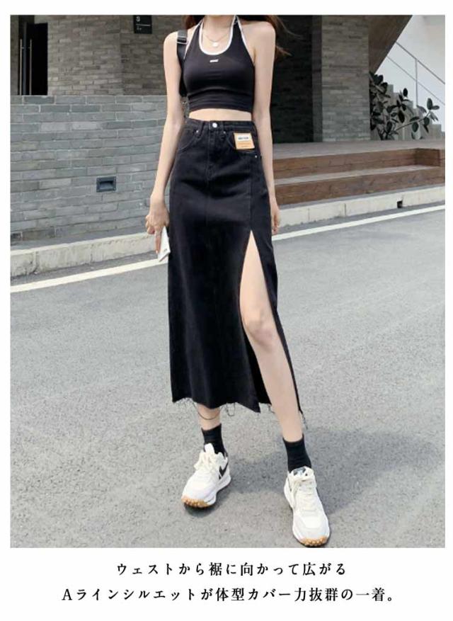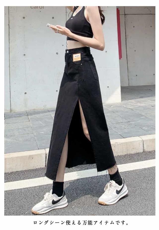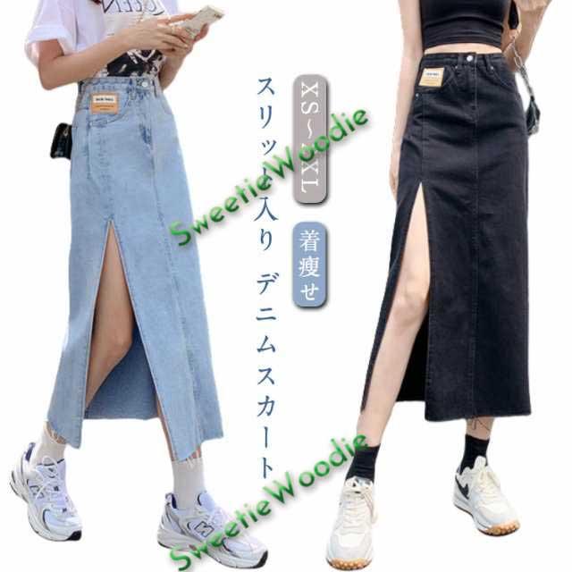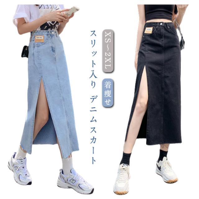 ハイウエスト スカート スリット入り デニム 美脚 着?せ ロング ロング丈 ロングスカート マキシ 脚長効果 膝下 無地 ロングスカート シンプル 大きいサイズ 大人 デニムスカート フレア デニムスカート 女性 可愛い 春夏